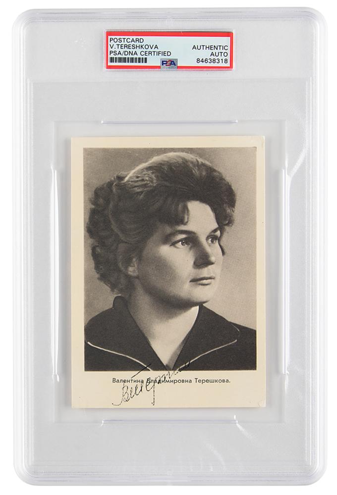 Vintage matte-finish 4 x 5.75 head-and-shoulders photo of the first woman in space, Valentina Tereshkova, signed at the bottom of the image in fountain pen. In fine condition, with slight ink adhesion issues. Encapsulated in a PSA/DNA authentication holder.