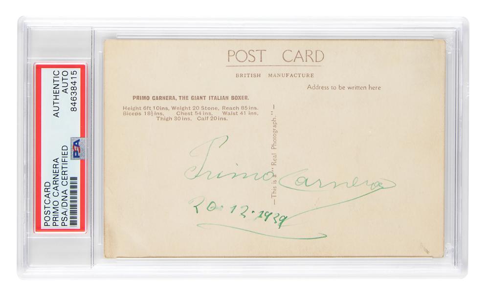 Early vintage glossy 3.5 x 5.5 postcard photo of the giant Italian boxer striking a strongman pose, signed on the reverse in green fountain pen, "Primo Carnera, 20.12.1939." In very good to fine condition, with heavy creasing to the photo side. Encapsulated in a PSA/DNA authentication holder.