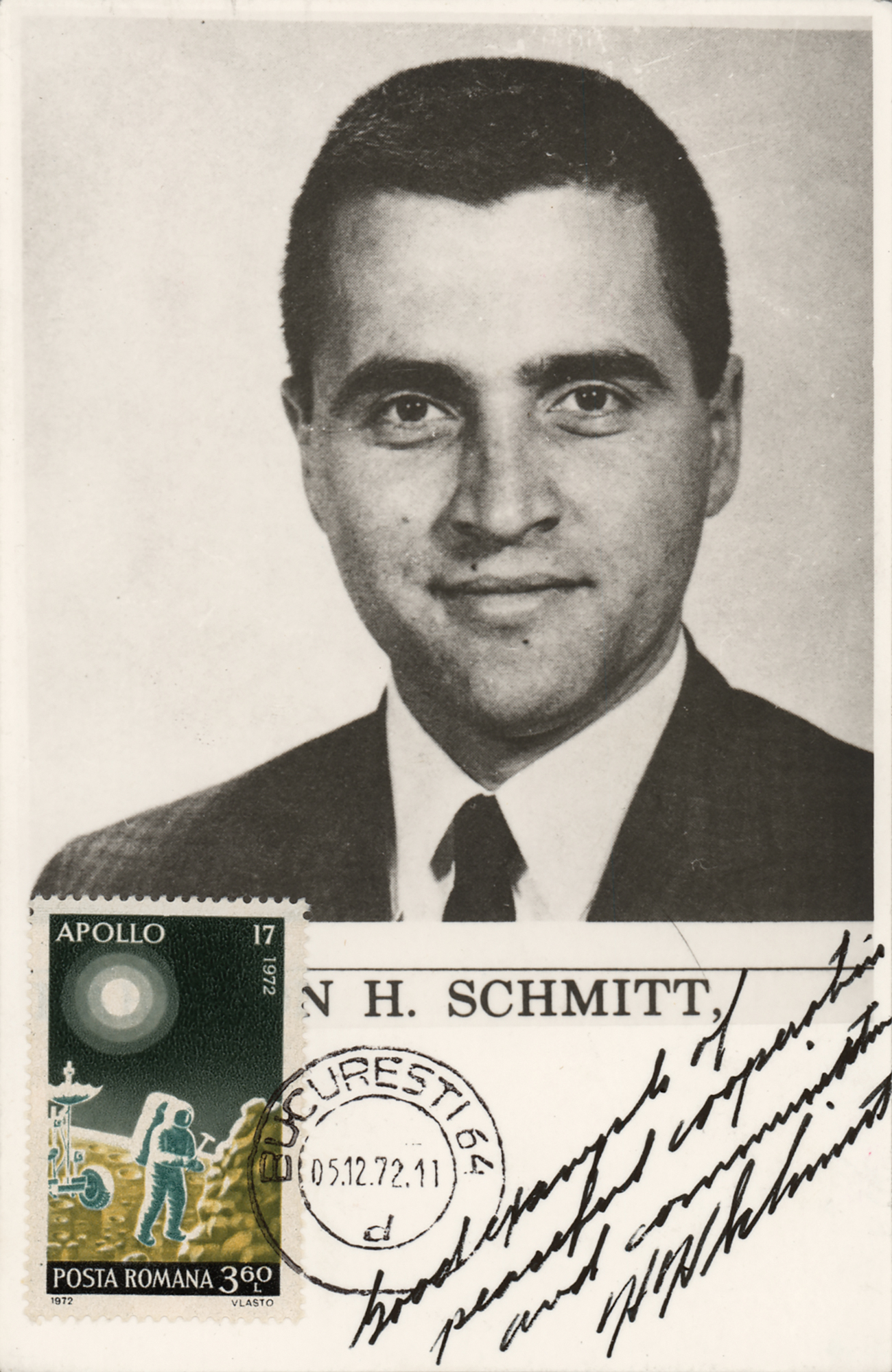 Matte-finish 3.5 x 5.25 Romanian postcard photo of Schmitt in a head-and-shoulders pose, signed in black felt tip, "Good example of peaceful cooperation and communication, H. H. Schmitt." A Romanian stamp honoring the Apollo moon landings is applied in the lower left. In very fine condition.