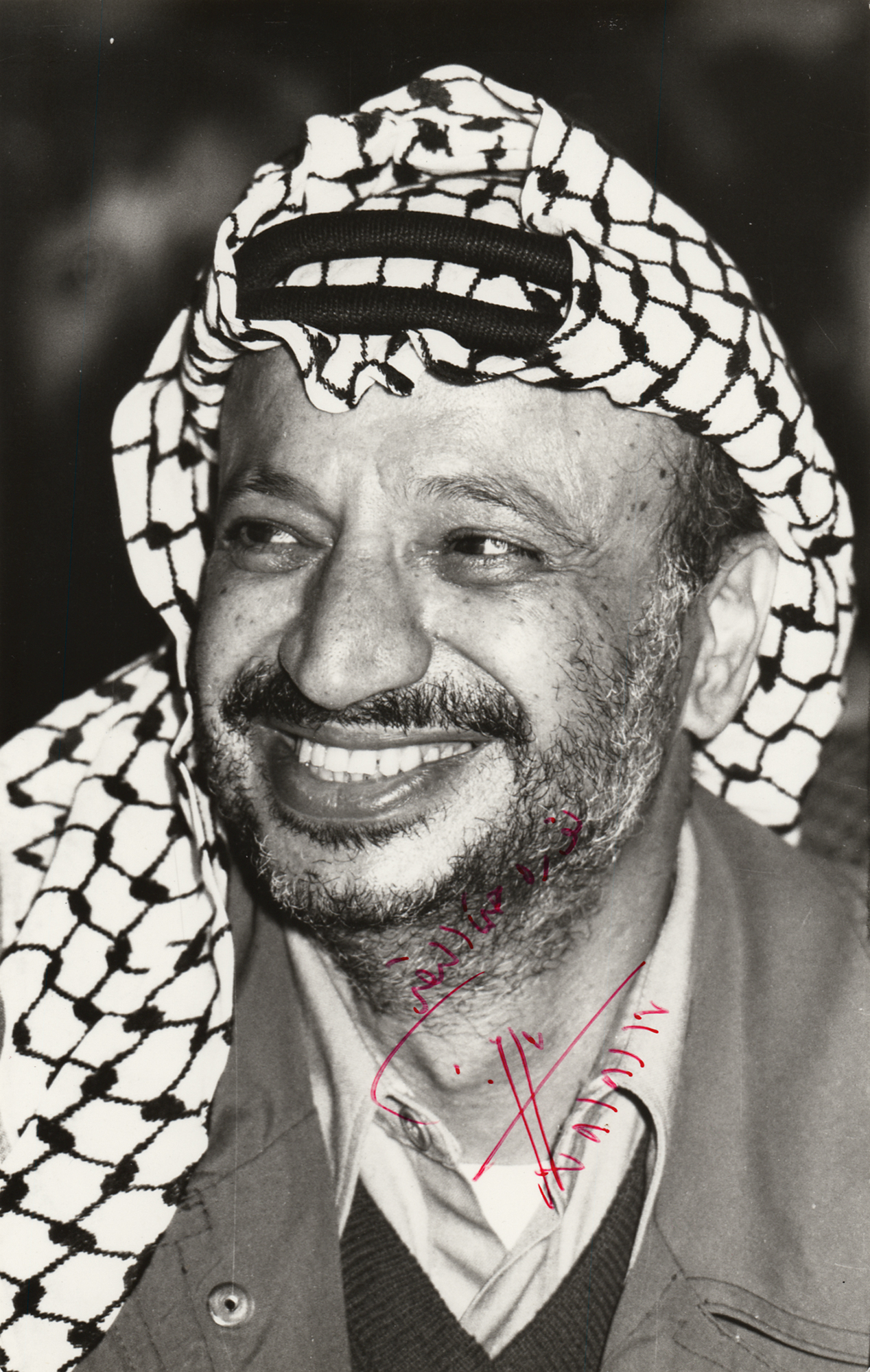 Vintage glossy 4.5 x 7 close-up photo of the Palestinian leader, signed in red ballpoint. In fine condition, with a thin crease across the top and light overall surface spotting.