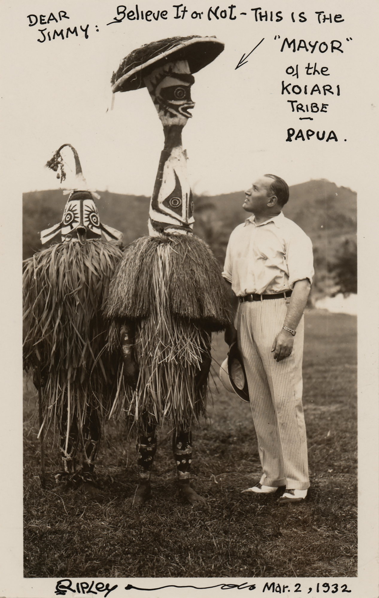 Interesting vintage glossy 3.5 x 5.5 photo of the globe-trotting oddity collector, boldly signed and inscribed in fountain pen, "Dear Jimmy: Believe It or Not—this is the 'Mayor' of the Koiari Tribe, Papua, Ripley—Mar. 2, 1932.” In fine condition, with a light paperclip impression to the top edge.