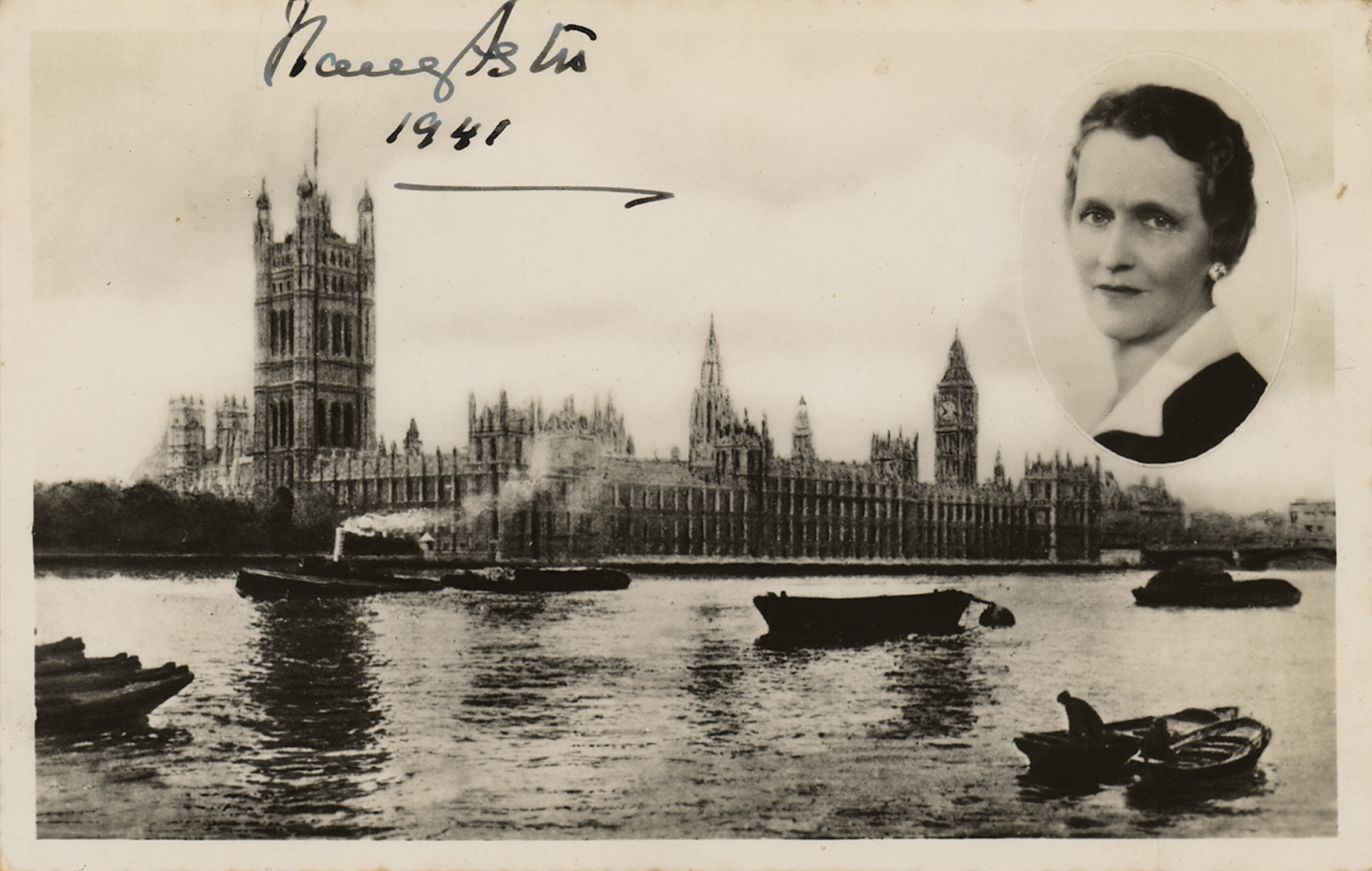 American-born English socialite (1879-1964) who married Waldorf Astor and became the first woman to sit as a Member of Parliament in the House of Commons. Vintage matte-finish 5.5 x 3.5 photo of the Palace of Westminster as seen from the Thames, with an inset portrait of Astor, neatly signed in fountain pen, "Nancy Astor, 1941." In fine condition.