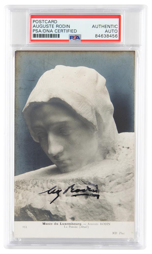 Vintage matte-finish 3.5 x 5.5 postcard photo of Auguste Rodin's sculpture 'Le Pensee,' boldly signed in fountain pen, "Aug. Rodin." In very good to fine condition, with silvering to the dark background. Encapsulated in a PSA/DNA authentication holder.