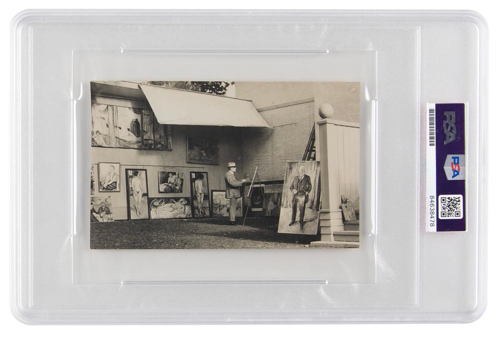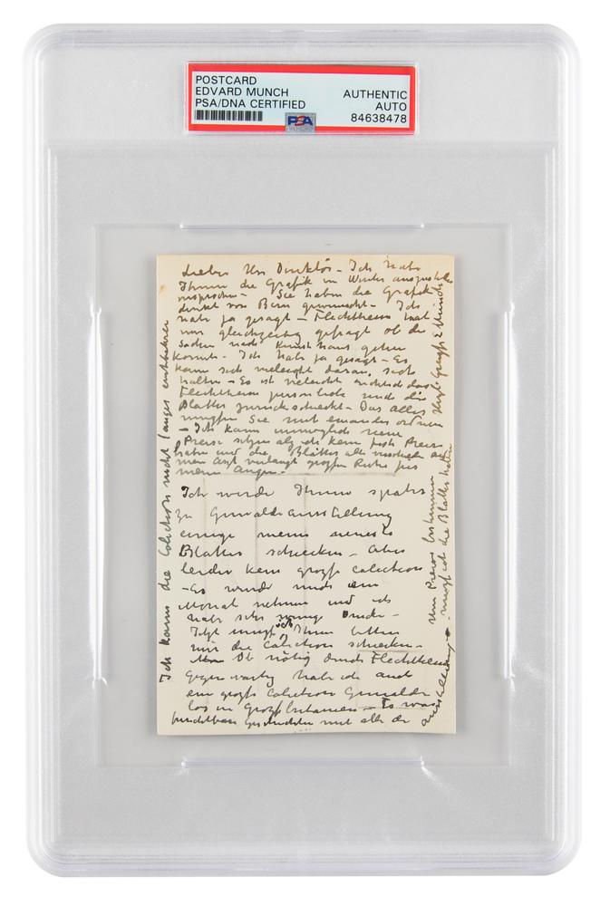 Influential Norwegian painter and printmaker (1863-1944) known for his intense and evocative treatment of psychological themes. ALS in German, signed “E. Munch,” one page on a 5.75 x 3.5 postcard depicting Munch at an easel surrounded by his works, no date. Letter to the director of the Kunsthaus Zurich, Wilhelm Wartmann, whose portrait Munch painted in 1923. In part (roughly translated): "I have promised you the artwork in?You have requested the graphic?from Bern. I said yes—Flechtheim asked at the same time if he could give things to Kunsthaus. I said yes. He can very much hold on to it. It is perhaps right the Flechtheim personally me the plates sent back. You have to arrange all these things together. I can not possibly set new prices as I can have fixed prices?I will send you some of my latest sheets later on to the exhibition of paintings. But unfortunately no great collection. It would take me to morals and I have very little pressure. Now I have to ask you to send me the collection. If necessary by Flechtheim presently I have also a great collection painting loose in the UK. So what a terrible story with all the exhibitions. To get prices I must have the sheets?I can not miss the collection for a long time." In fine condition. Alfred Flechtheim was a German art dealer and collector. Encapsulated in a PSA/DNA authentication holder.