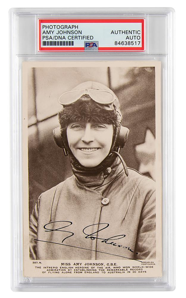 English aviatrix (1903-1941) who became the first female pilot to fly alone from Britain to Australia. Uncommon glossy 3.5 x 5.5 Beagles postcard photo of Johnson in her aviator uniform, nicely signed in black ink. Affixed to a same-size sheet. In very good to fine condition, with light wrinkling from mounting, and light brushes of old adhesive at edges, visible only at an angle. Encapsulated in a PSA/DNA authentication holder.