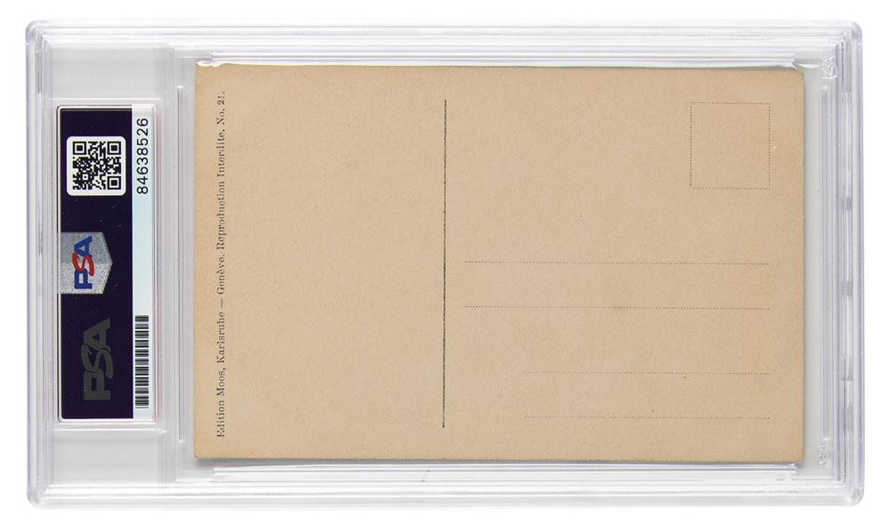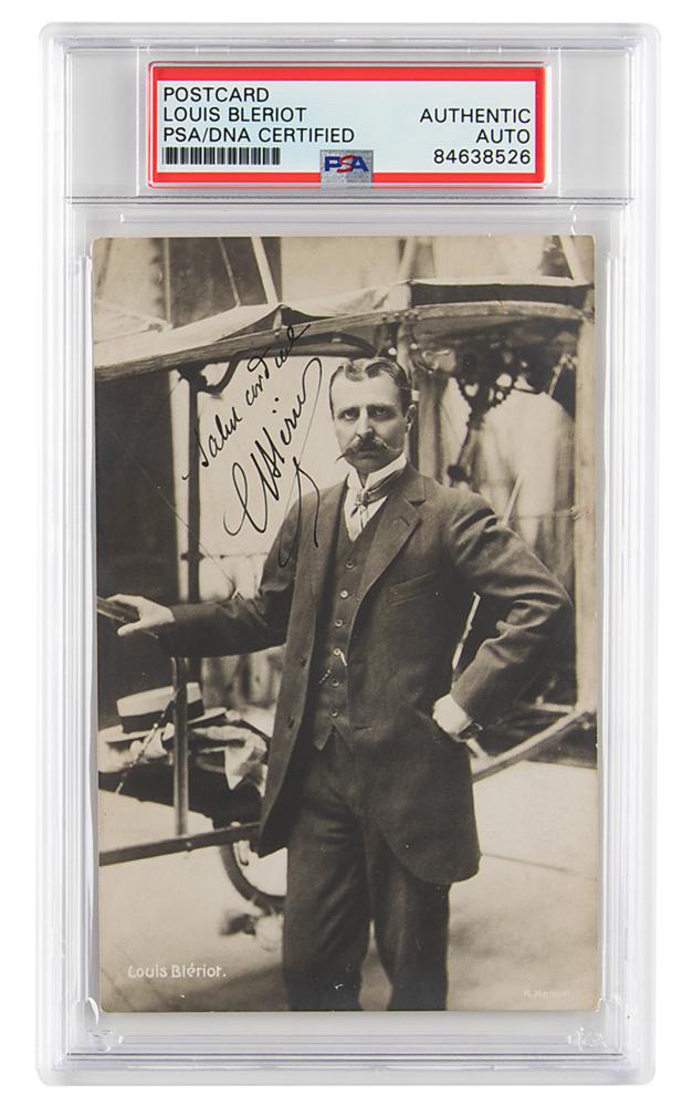 French engineer and aviator (1872-1936) who made the first crossing of a large body of water in a heavier-than-air craft when he flew across the English Channel in 1909. Vintage matte-finish 3.5 x 5.25 postcard photo of Louis Bleriot by photographer Henri Manuel, signed in fountain pen, "Salut cordial, L. Bleriot." In very fine condition. Encapsulated in a PSA/DNA authentication holder.