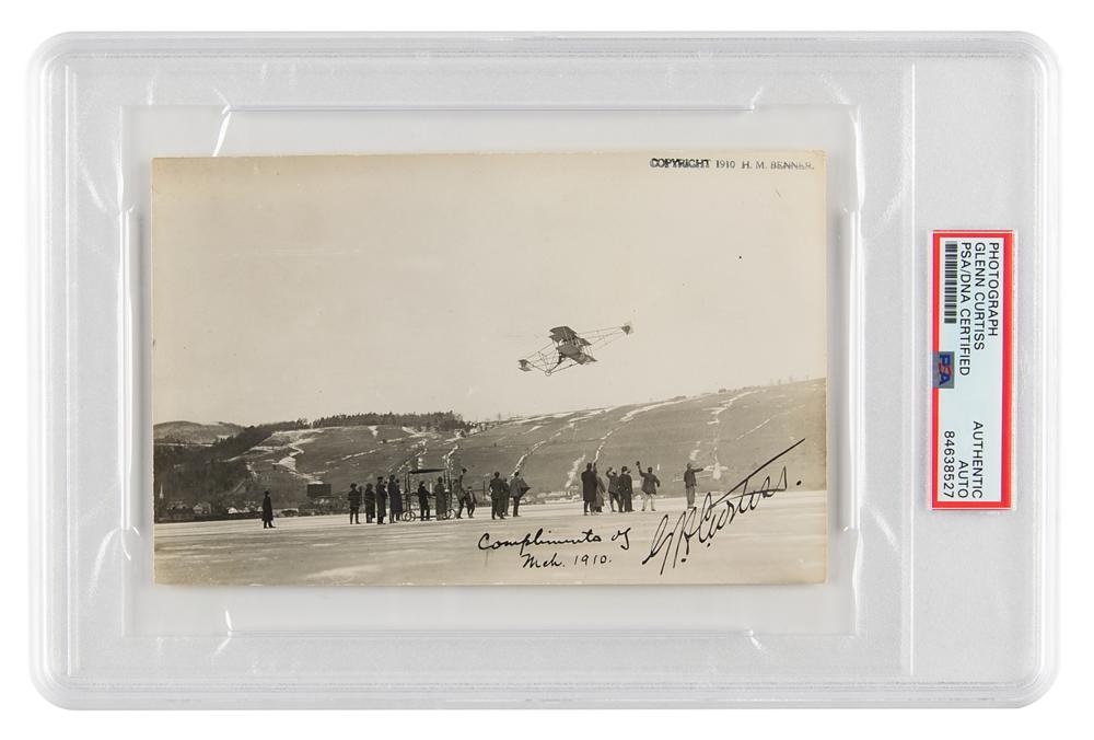 Aircraft designer and manufacturer (1878-1930) who pioneered such far-reaching innovations as the aileron, the pontoon airplane, the flying boat, dual pilot controls, and the retractable landing gear. Vintage semi-glossy 6.5 x 4.25 photo of a crowd of spectators watching the Curtiss plane preparing to land, signed in fountain pen, "G. H. Curtiss," with an adjacent date notation penned in an unknown hand, "Compliments of, March 1910," and an H. M. Benner photography stamp to the upper right. In fine condition. Encapsulated in a PSA/DNA authentication holder.