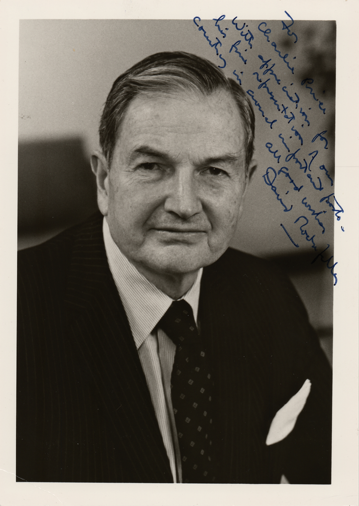 Cardstock 5 x 7 photo of the investment banker, signed and inscribed in blue felt tip, "For Charlie Price, With appreciation for his fine representation of our country in several important posts, all good wishes, David Rockefeller.” In fine condition, with light surface impressions.