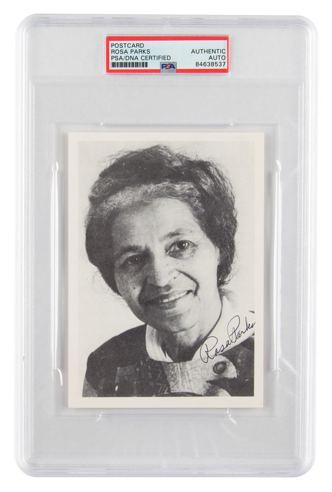 Desirable 4.25 x 6 postcard photo of the Civil Rights icon in her later years, signed in black ballpoint, "Rosa Parks." In fine condition. Encapsulated in a PSA/DNA authentication holder.