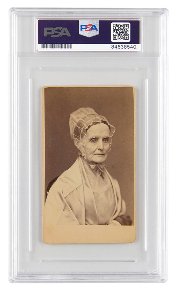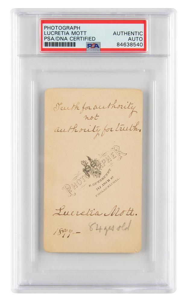 Reformer (1793-1880) active in the Underground Railroad and the first president of the American Equal Rights Association. Appealing 2.5 x 4 carte-de-visite bust portrait of the famed reformer, signed on the reverse in black ink by Mott, who adds a brief quote, "Truth for authority, not authority for truth, Lucretia Mott, 1877." In fine condition. Encapsulated in a PSA/DNA authentication holder.