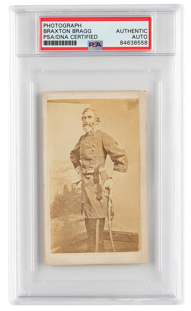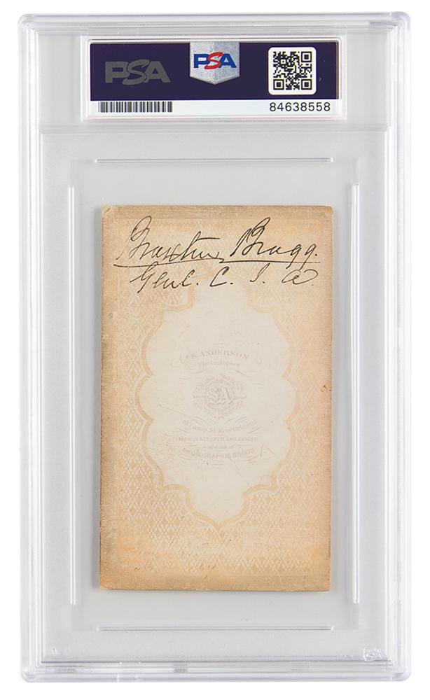 Confederate general (1817-1876) who was relieved of field duty after his unsuccessful siege of Chattanooga. His mixed legacy as a skilled organizer but a poor commander remains one of the great topics of debate among Civil War historians. Rare 2.5 x 4 carte-de-visite portrait of Bragg posing in his Confederate Army uniform, signed neatly on the reverse in ink, "Braxton Bragg, Genl. C. S. A.” Published by S. Anderson of New Orleans. In fine condition. Encapsulated in a PSA/DNA authentication holder.