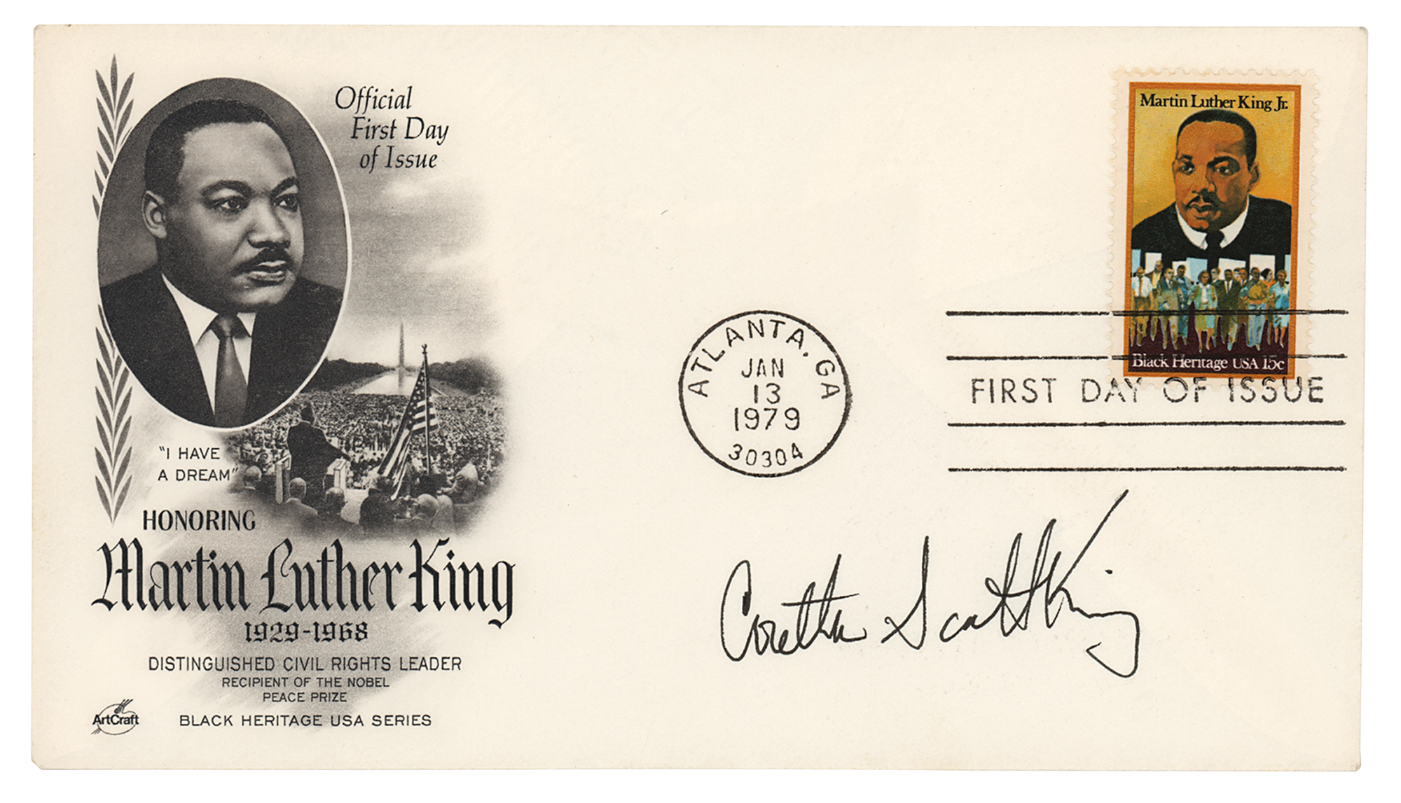 FDC with a cachet honoring the late Martin Luther King, Jr., signed in black felt tip by his widow, "Coretta Scott King." In very fine condition.