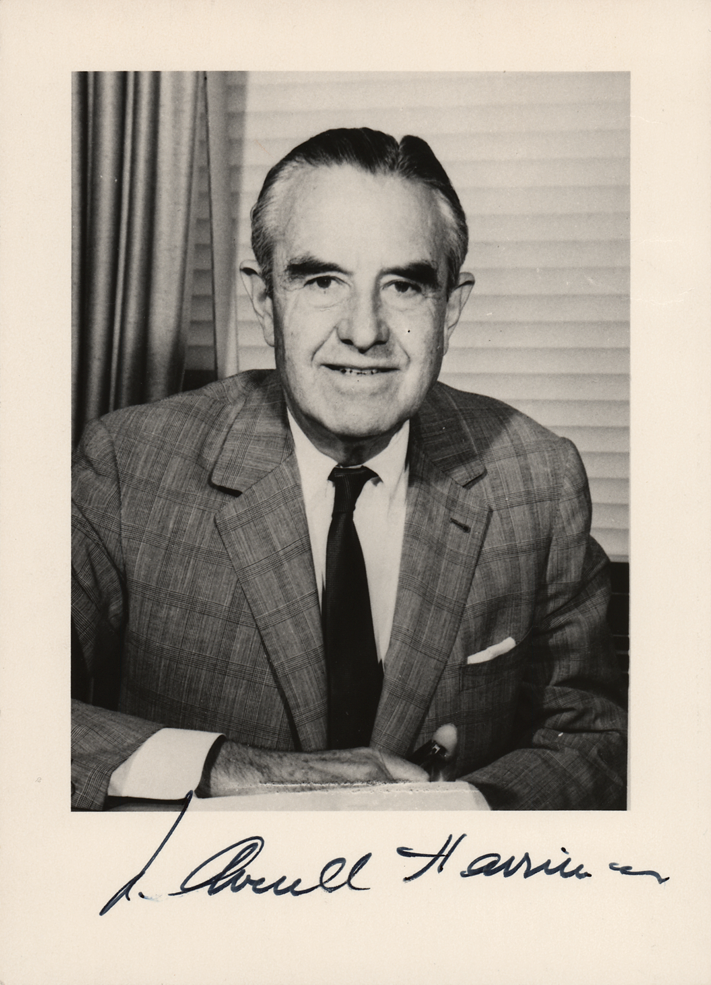 Vintage matte-finish 5 x 7 photo of Harriman at his desk, signed in the lower border in black ink. In very good to fine condition, with creasing to the upper right.