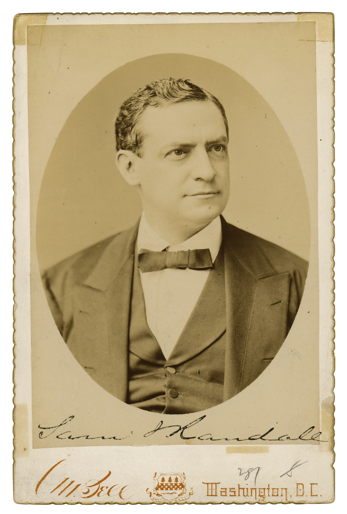 American politician from Pennsylvania (1828-1890) who served as the 29th Speaker of the House of Representatives, remembered as a staunch defender of protective tariffs. Uncommon 4.25 x 6.5 cabinet photo by C. M. Bell of Washington, signed at the bottom of the image in ink, "Sam. J. Randall." In fine condition, with small tape stains to the edges.
