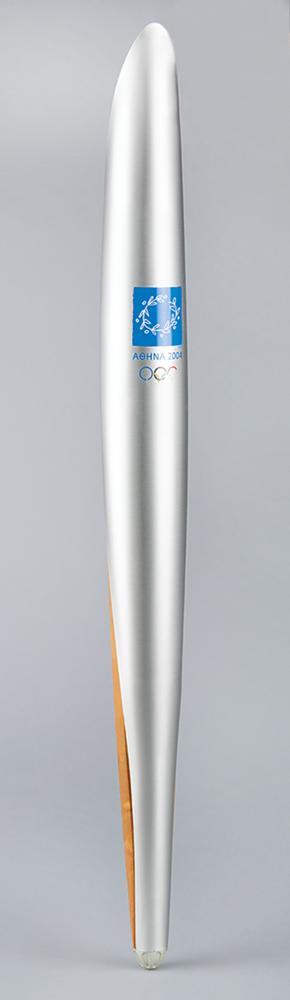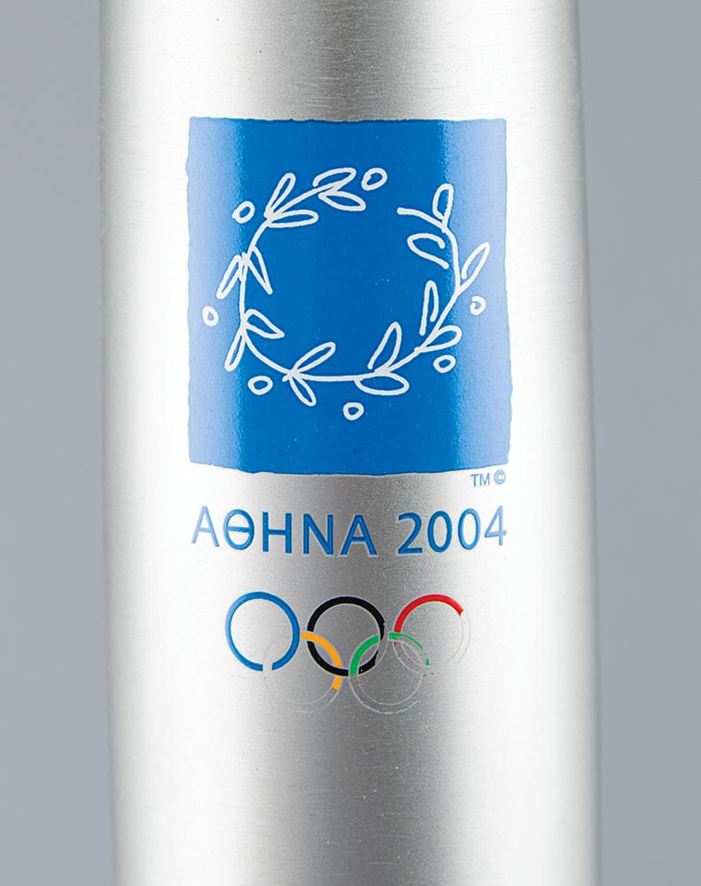 Official 2004 Athens Summer Olympics torch, constructed of aluminum and olive wood, measuring 25.75″ in length and 2.25″ at its widest point, designed by Andreas Varotsos and manufactured by GA & L Harrington. The torch was modeled to reflect the simple and congruous lines of an olive tree leaf, with the union of wood and metal evoking the different colors found on either side of the leaf, and the ergonomic design representing the extension of the moving flame. The front of the aluminum sheath bears the Olympic rings and Athens emblem, with Greek engraving below presented to Lena Zachopoulou. Some fading to Olympic rings enamel on the sheath, which also bears some light scuffing. Includes its original tube. The Olympic flame was lit in Olympia, Greece, on March 25, 2004, and proceeded on a five continent journey that witnessed the torch pass by all the cities that had hosted the Games since 1896, as well as marking the flame's debut in Africa, India, and South America. In total, the torch covered over 84,000 km during its 141-day journey.