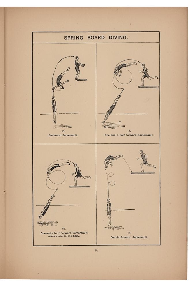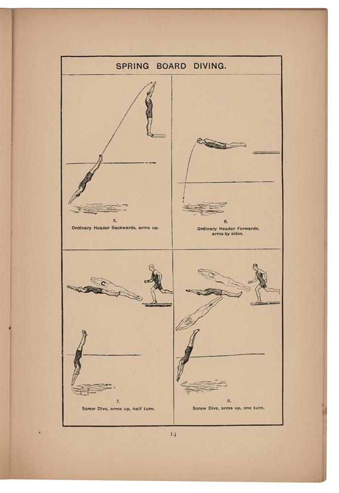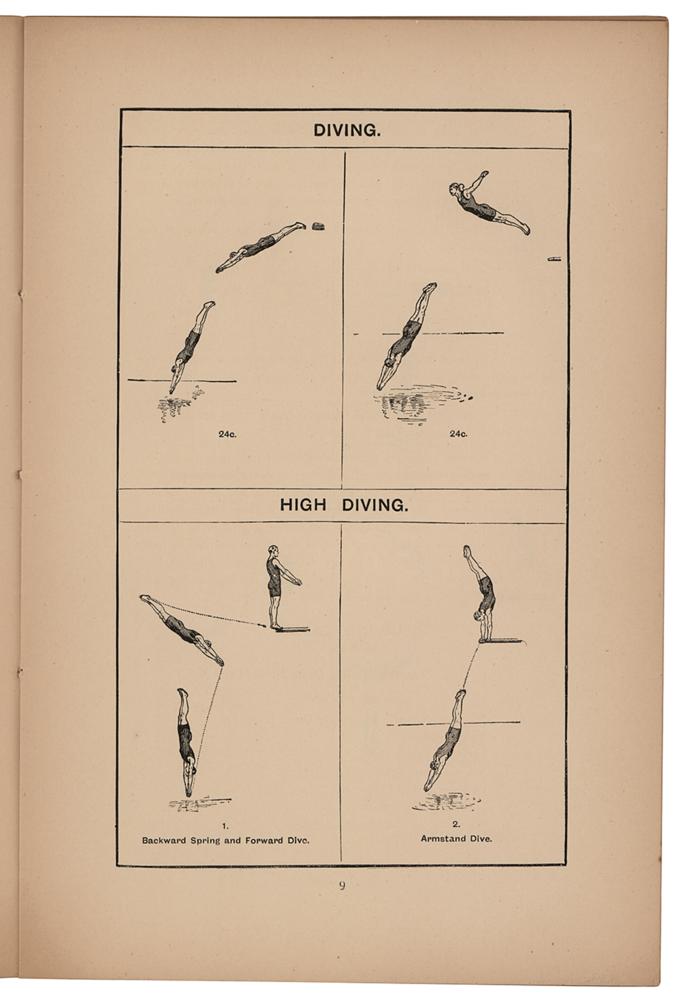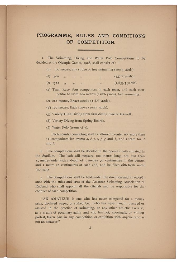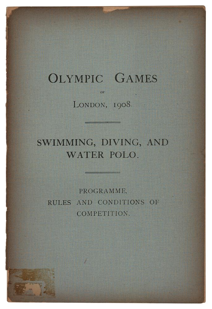 Scarce “Rules and Conditions of Competition” program for swimming, diving, and water polo events at the London 1908 Olympics. Published by the British Olympic Council and printed by Spottiswoode & Co., the booklet, 23 pages, 6.5 x 9.75, contains rules and regulations for the aforementioned sports, in addition to several amusing illustrations for the diving events. The program lists sections for 100 meters, 400 meters, 1,500 meters, high diving, fancy diving, 200 meters team race (teams of four), 200 meters breaststroke, 100 meters backstroke, and water polo (teams of seven). In very good condition, with the front and back covers detached and fragile, with the interior of the front cover bearing an affixed "The British Olympic Association" bookplate, which has produced a block of toning to the title page.