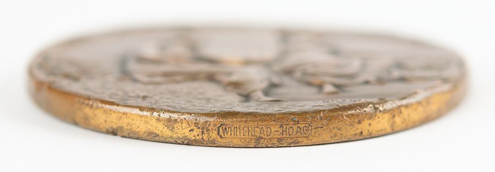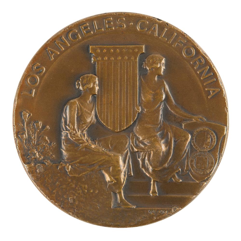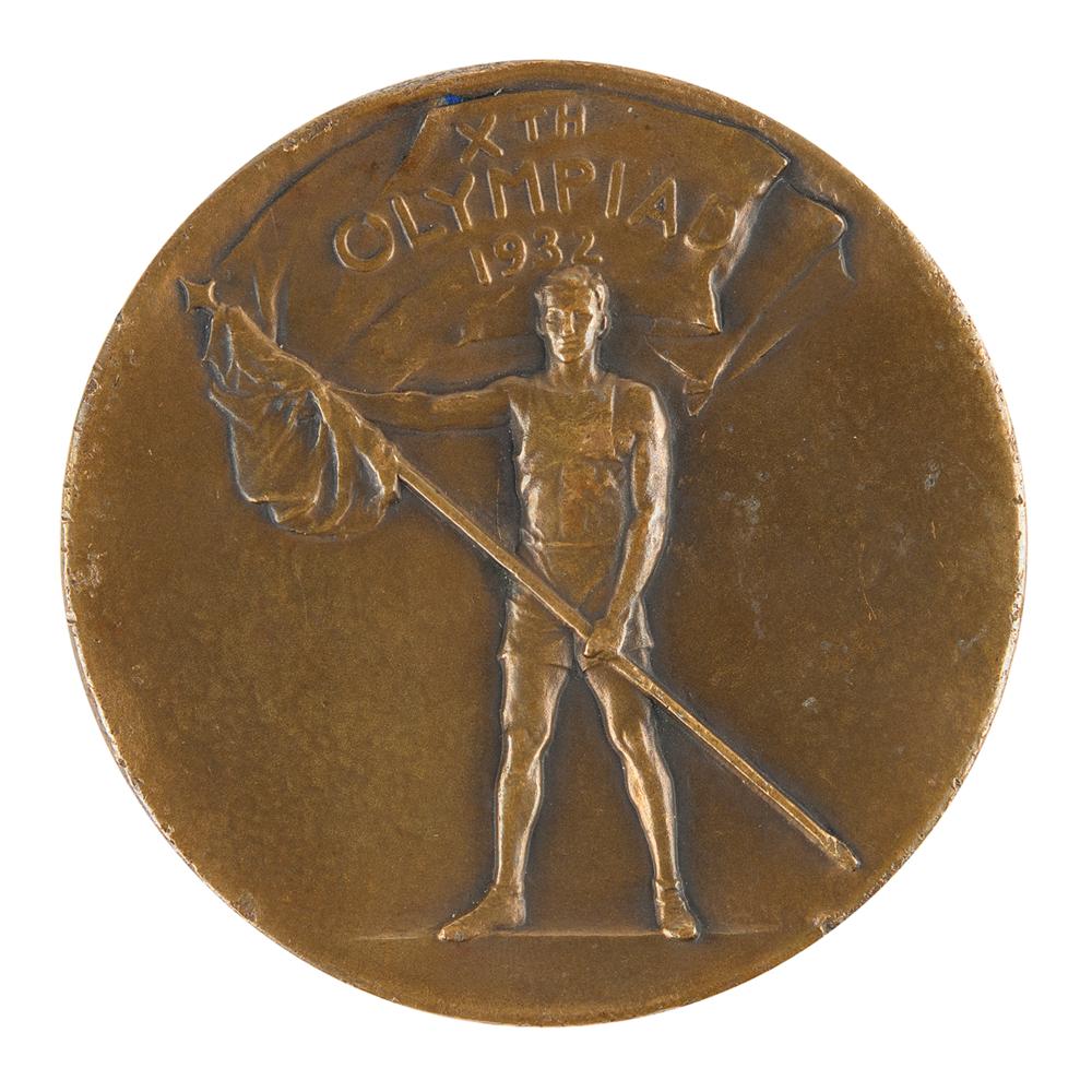 Uncommon participation medal issued for the Los Angeles 1932 Summer Olympics. Bronze, 69 mm, 147 gm, by Julio Kilenyi. The front depicts an athlete standing with an unfurled Olympic flag reading "Xth Olympiad 1932." The reverse features two seated female figures supporting the shield of the United States under raised text, "Los Angeles, California"; the figure on the left is holding an olive branch, and the other rests her hand on a shield bearing the seals of the State of California and the City of Los Angeles. Edge bears the engraved maker's mark of the mint, "Whitehead-Hoag."
