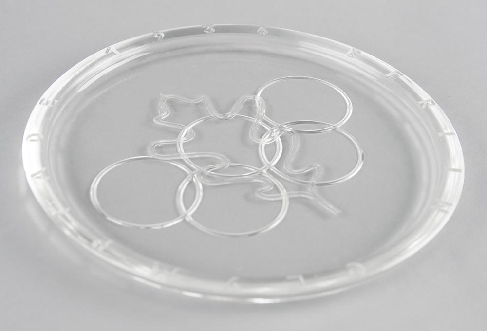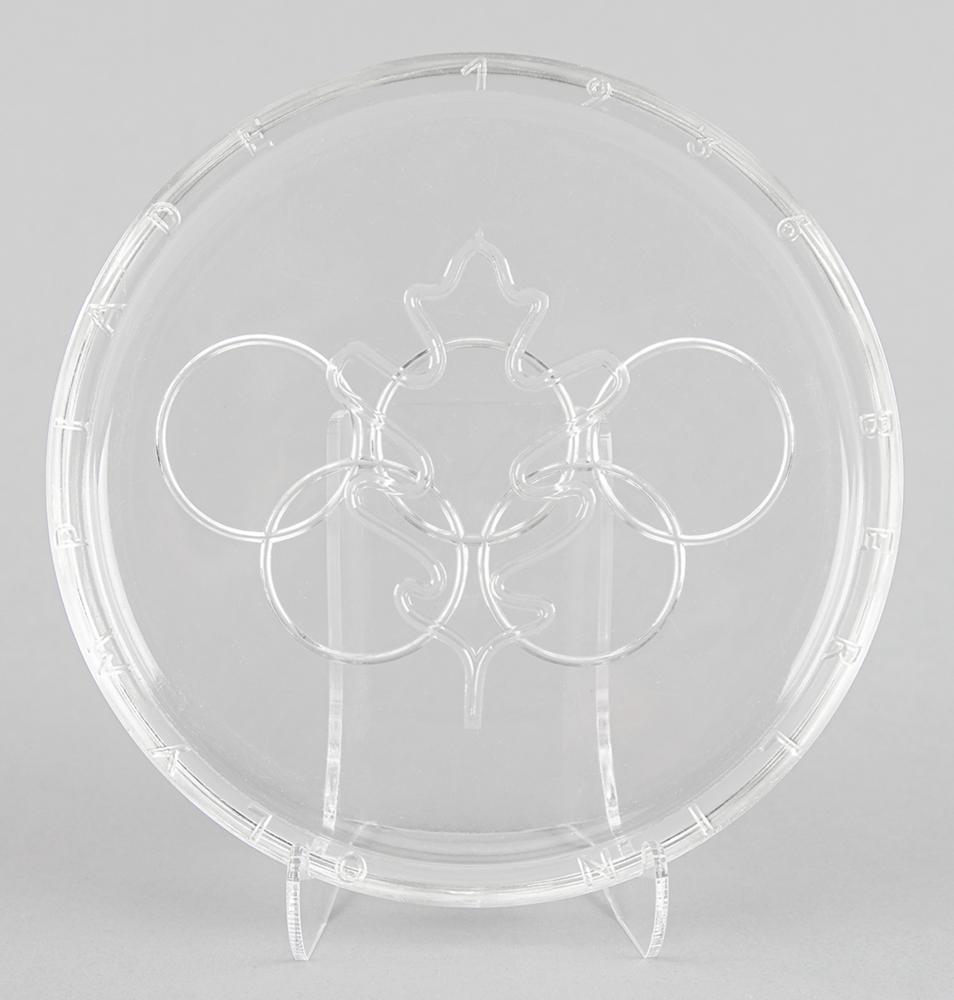 Attractive souvenir glass plate from the Berlin 1936 Summer Olympics, measuring 7.75″ in diameter and .5″ from base to rim, which is encircled with neatly engraved lettering: “Berlin Olympiade 1936.” The well of the plate features a raised outline of an oak leaf and the bottom of the plate is etched with the Olympic rings. In fine condition, with light scattered scuffs and scratches.