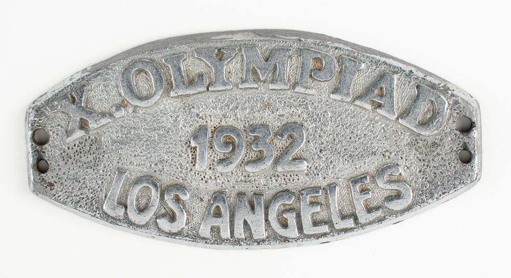 Souvenir metal car badge from the Los Angeles 1932 Summer Olympics, measuring 4 x 2, with raised text: “X. Olympiade, 1932, Los Angeles.” In fine condition. An understated and plaque-like car badge from the historic 10th Olympiad.