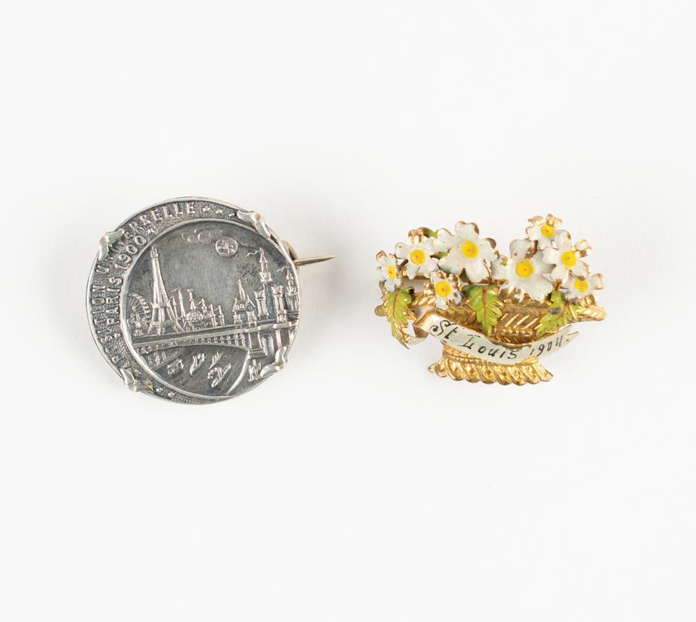 Uncommon pairing of souvenir pins from the Paris 1900 Exposition and Olympics and the St. Louis 1904 Exposition and Olympics. In both cases, the Olympics were part of the Exposition Universelle and the Louisiana Purchase Exposition. The Paris 1900 pin is silver-tone, 25 mm, with a crescent space to left containing raised text, “Exposition Universelle, Paris 1900,” and the main design showing various Parisian landmarks such as the Pont Alexandre III bridge and the Eiffel Tower; and the St. Louis 1904 pin is gold-tone, 25 mm x 31 mm, and features a cluster of white cosmos flowers filled in a basket with the front banner, “St. Louis 1904.” In overall fine condition.