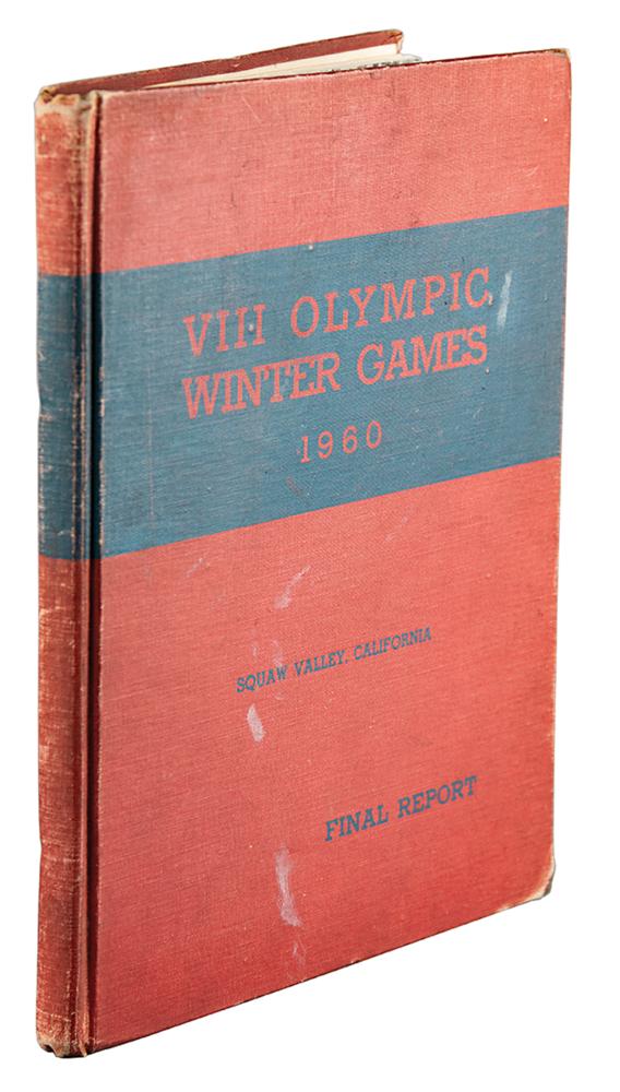 Uncommon and desirable official report: VIII Olympic Winter Games, 1960, Squaw Valley, California, Final Report. Published by the California Olympic Committee, 1960. Hardcover, 8.5 x 11.25, 160 pages. In good to very good condition, with scattered dampstaining, overall rippling to inner pages due to moisture exposure, and some edgewear and staining to boards.
