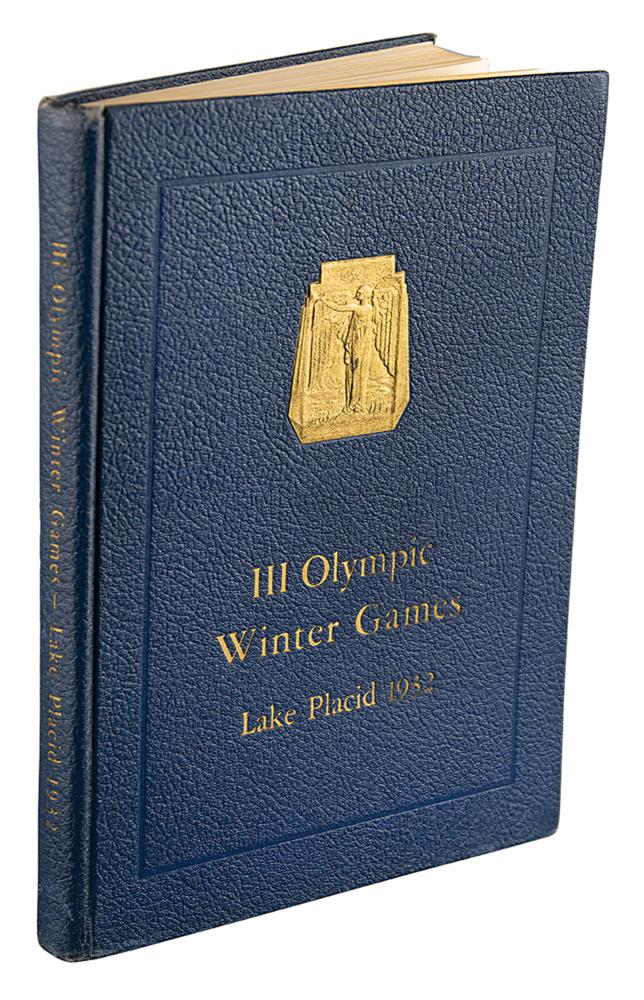 Scarce book: Official Report, III Winter Games, Lake Placid 1932. Issued by the III Olympic Winter Games Committee. Hardcover handsomely bound in original navy cloth with gilt titles and winner's medal emblem, 8 x 11, 209 pages. Book condition: VG+/None, with minor rubbing to boards and a trivial stain to first free end page.