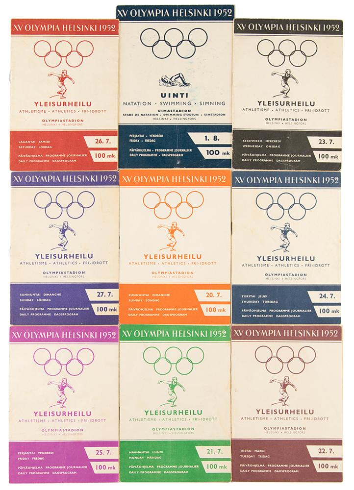 Group of nine daily programs from the Helsinki 1952 Summer Olympics, including one for the events at the Swimming Stadium on August 1st, and eight for the athletic events at the Olympic Stadium, for July 20th-27th. The group makes for an appealing display as each cover is printed in a different color. In very good to fine condition, with light overall wear including soft folds and creases, some minor foxing and staining, and various results-related pencil notations inside.
