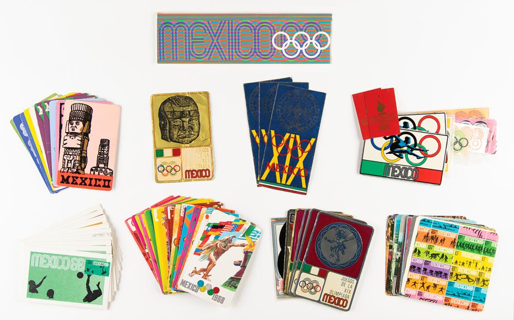 Large collection of over 130 postcards, decals, and ephemera from the 1968 Mexico City Summer Olympics, with many of the postcards and decals duplicated. Includes: a complete Mexico City 1968 'cube' booklet, with unfolded cardboard cubes intact inside; eleven postcards with raised corduroy fabric designs in various themes, ranging from the Aztec calendar to sporting event pictograms; more than 50 postcards with caricatures of various events, including boxing, field hockey, weightlifting, gymnastics, swimming, rowing, wrestling, and fencing; nineteen postcards with the logo of the Games over a solid-color background, with silhouetted athletes below; a set of fifteen square postcards depicting the Olympic Stadium, village, events, and logos; ten unused metallic adhesive decals featuring Aztec and Olmec emblems; four decals with various emblems of the Games, including the Olympic flame, peace dove, and Olympic torch; seven long rectangular decals of the Mexico '68 official logo; twelve other decals with various emblems associated with the Games; four Olympic peace doves; and a handful of other related decals.
