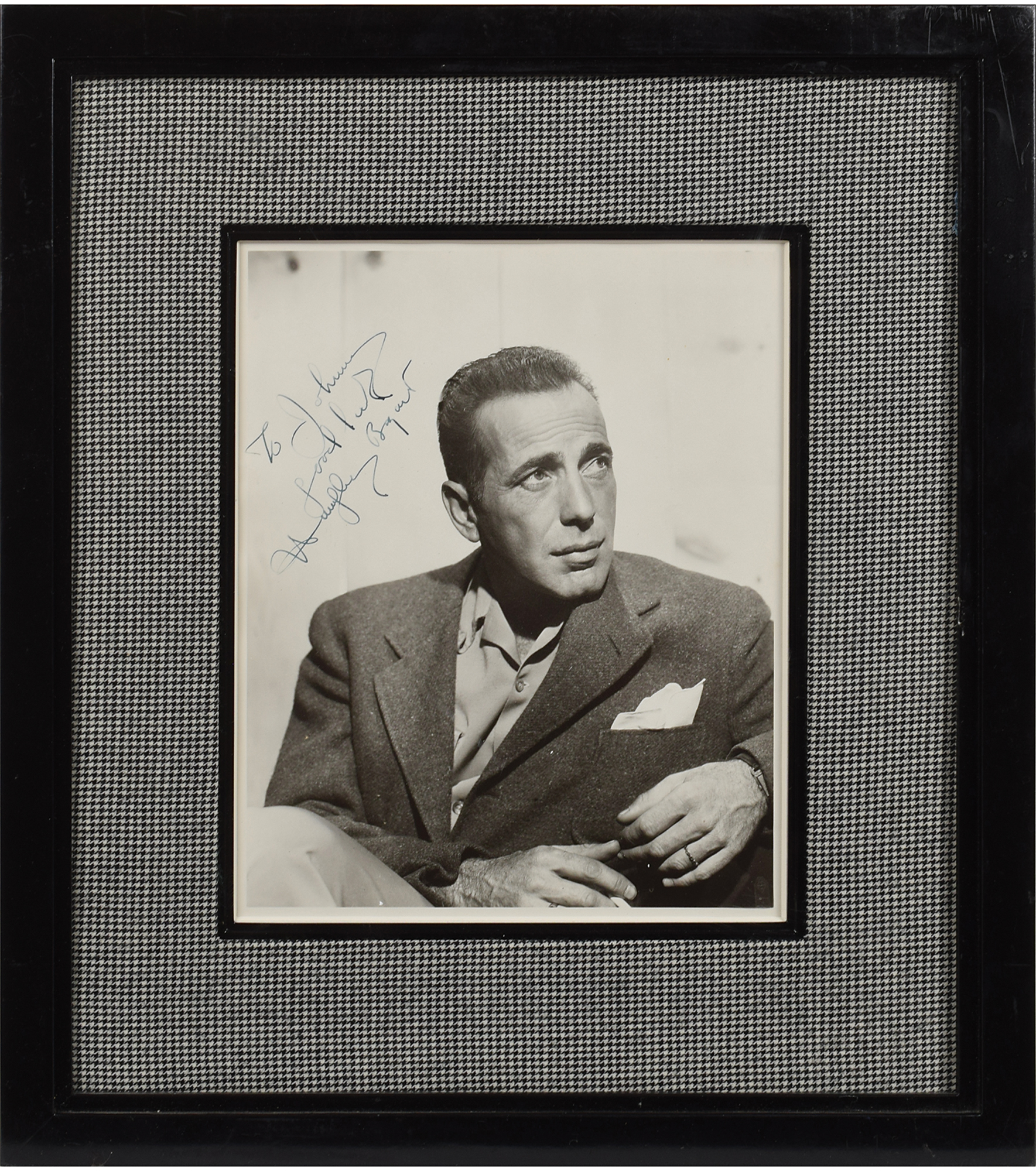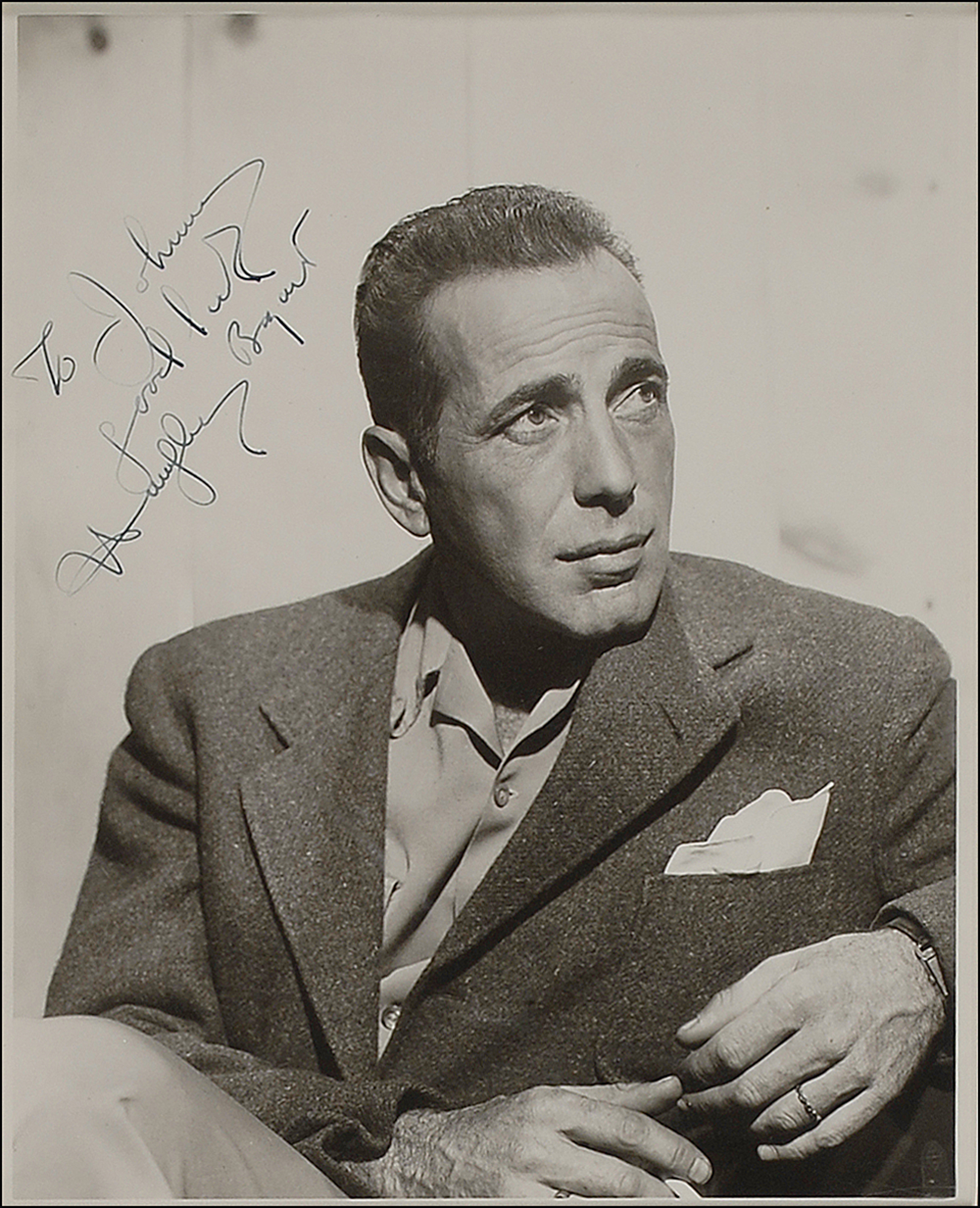 Vintage matte-finish 8 x 10 photo of Bogart in a blazer looking pensively skyward, beautifully signed and inscribed in fountain pen, "To Johnny, Good luck, Humphrey Bogart." Archivally cloth matted and framed to an overall size of 14.5 x 16.5. In fine condition. A striking pose of Hollywood's legendary leading man that boasts a beautifully penned, bold autograph.