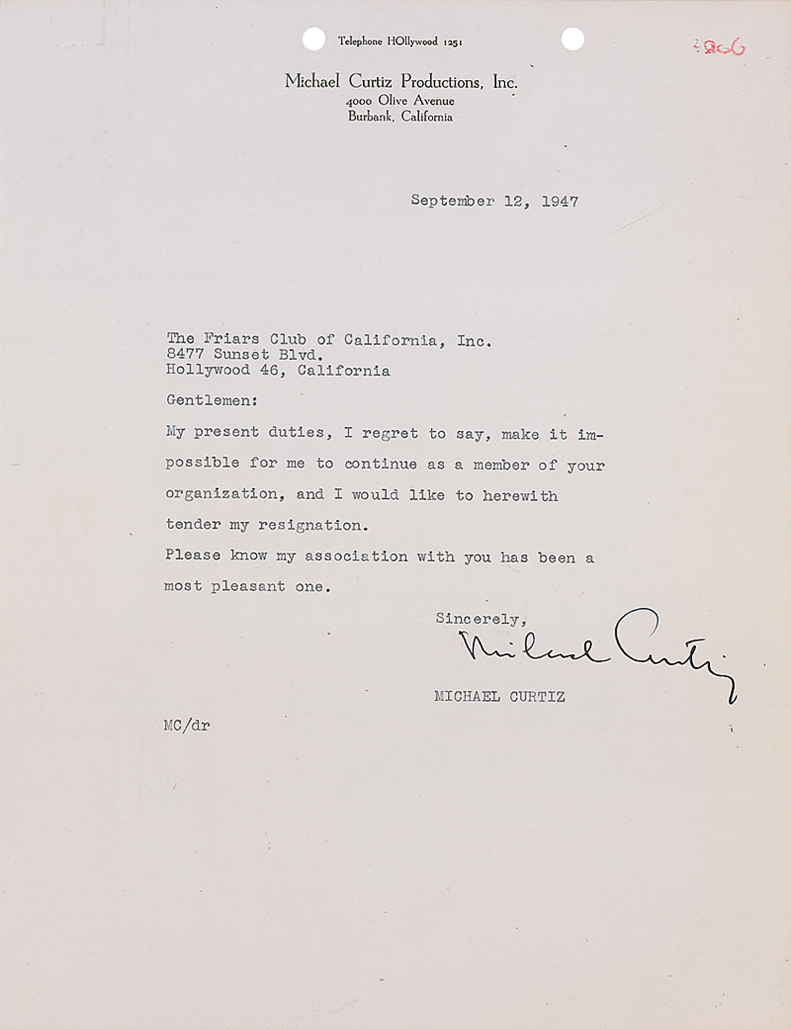 Distinguished Hungarian-born American film director (1886-1962) who helmed such all-time classics as Casablanca, Angels with Dirty Faces, Yankee Doodle Dandy, and White Christmas. TLS, one page, 8.5 x 11, Michael Curtiz Productions letterhead, September 12, 1947. Letter to the Friars' Club of California. In part: "My present duties, I regret to say, make it impossible for me to continue as a member of your organization?My association with you has been a most pleasant one." In fine condition, with filing and staple holes to top.