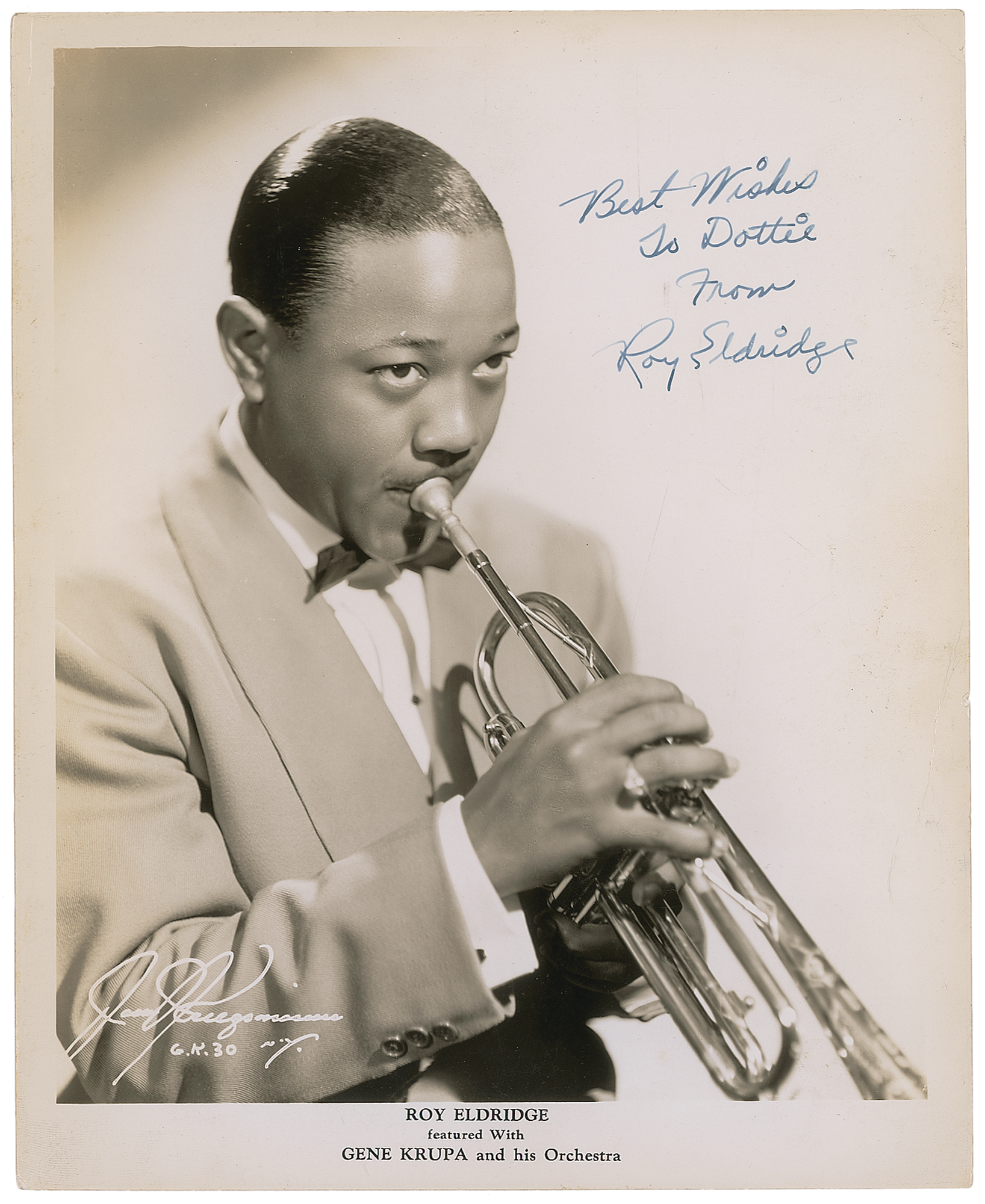 Jazz trumpet player (1911-1989) nicknamed 'Little Jazz,' who was known for his sophisticated use of harmony, virtuosic solos, and mastery of the instrument's highest register. Vintage glossy 8 x 10 publicity photo for Eldridge as part of Gene Krupa's orchestra, signed and inscribed in bold blue fountain pen, "Best Wishes To Dottie, From Roy Eldridge." In fine condition, with a diagonal crease to lower right edge.