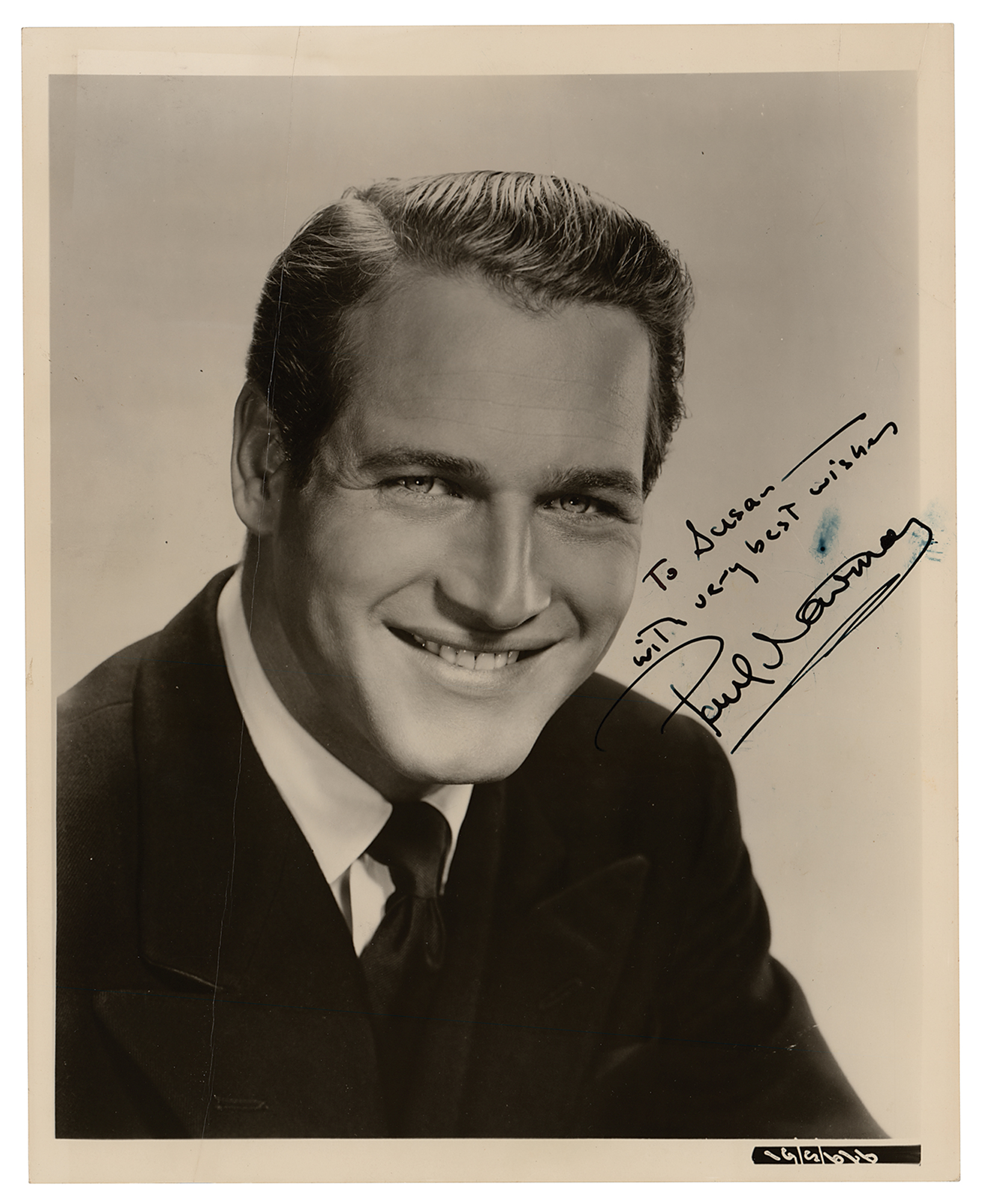 Handsome vintage glossy 8 x 10 photo of the smiling star, signed and inscribed in fountain pen, "To Susan—with very best wishes, Paul Newman.” In very good condition, with a couple of ink smudges, creases touching the top of Newman's head, and a long vertical crease passing through his ear.