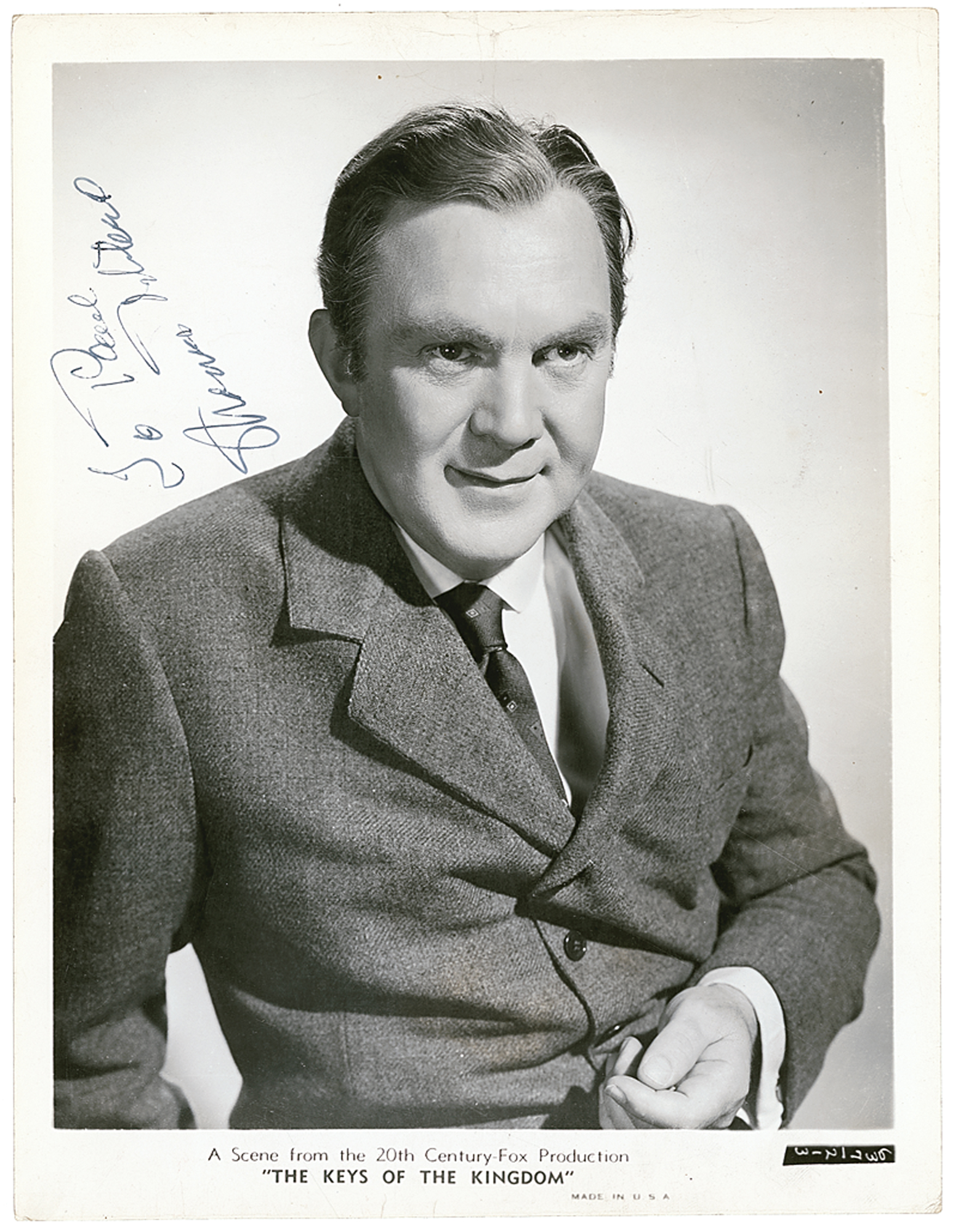 Prolific American character actor (1892-1962) who was the first performer to win an Oscar (for his supporting role in Stagecoach), an Emmy, and a Tony. His most familiar roles are probably those of Scarlett O'Hara's father in Gone With the Wind and Uncle Billy in the classic It's a Wonderful Life. Vintage glossy 8 x 10 20th Century Fox promotional photo for The Keys of the Kingdom, signed and inscribed in fountain pen, "To Paul, Thomas Mitchell." In very good to fine condition, with scattered creasing.