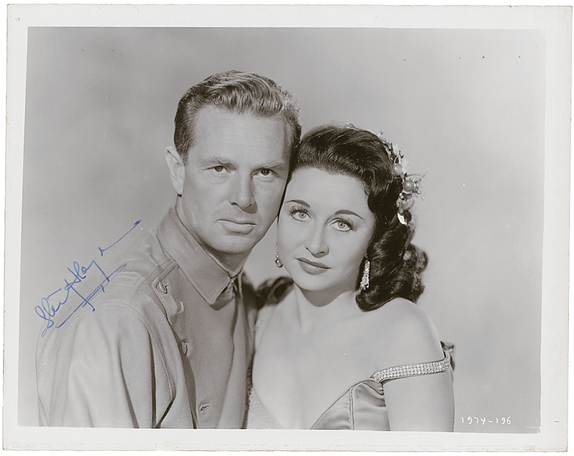 Vintage glossy 10 x 8 publicity photo of Sterling Hayden and Vera Ralston from Timberjack, signed in blue fountain pen by Hayden. In fine condition, with scattered light creasing.