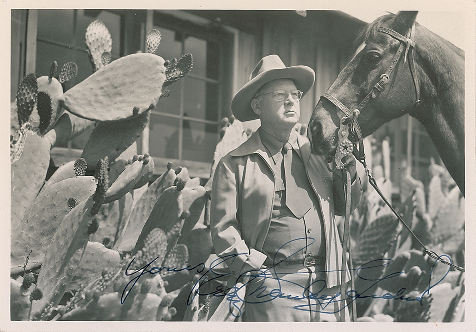 Lawyer-turned-writer (1889-1970) best known as the creator of fictional defense attorney Perry Mason. Vintage matte-finish 6.75 x 4.75 photo of Gardner with a horse and cactus, signed in fountain pen, "Yours, Erle Stanley Gardner." In fine condition, with moderate signature contrast.