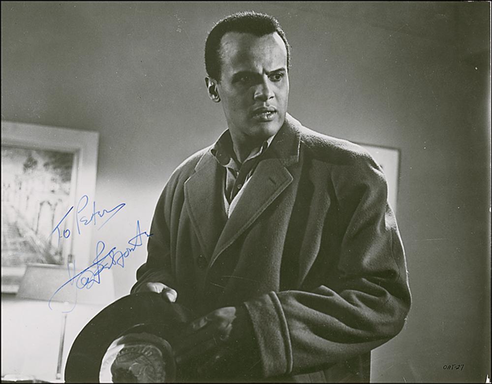 Vintage glossy 9.5 x 7.5 publicity photo of Belafonte in the 1959 film Odds Against Tomorrow, signed and inscribed in fountain pen, "To Peter, Harry Belafonte." In fine condition.