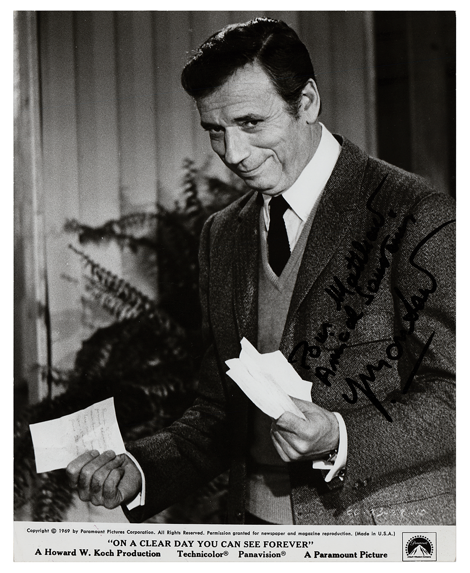 Glossy 7.75 x 9.75 Paramount promo photo for On a Clear Day You Can See Forever, signed and inscribed in black felt tip, "Pour Matthew, Amical souvenir, Y. Montand.” In fine condition, with trimmed edges.