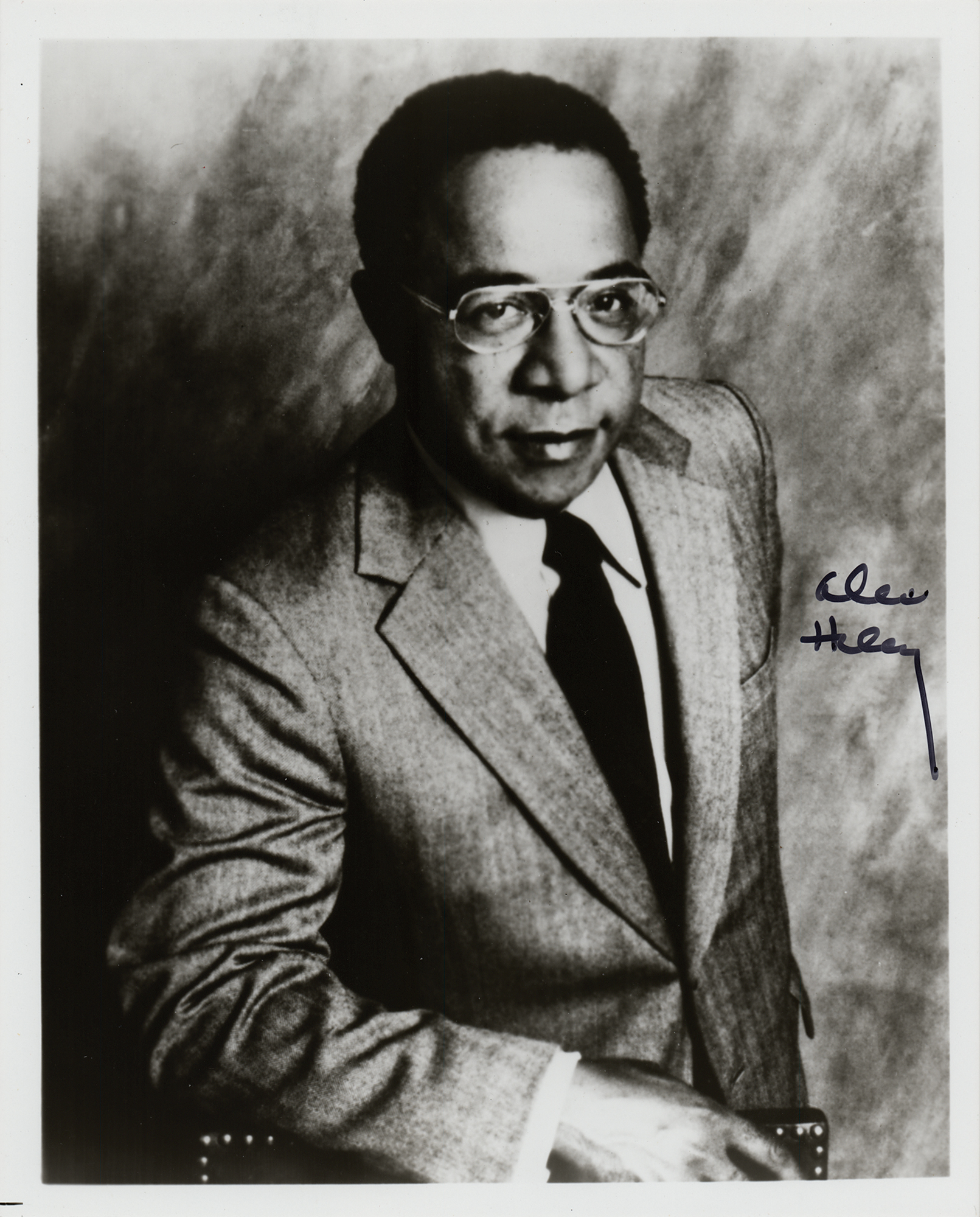 Glossy 8 x 10 photo of the Roots author in a half-length pose, nicely signed in black felt tip, "Alex Haley." In fine condition, with a light paperclip impression to the top edge.