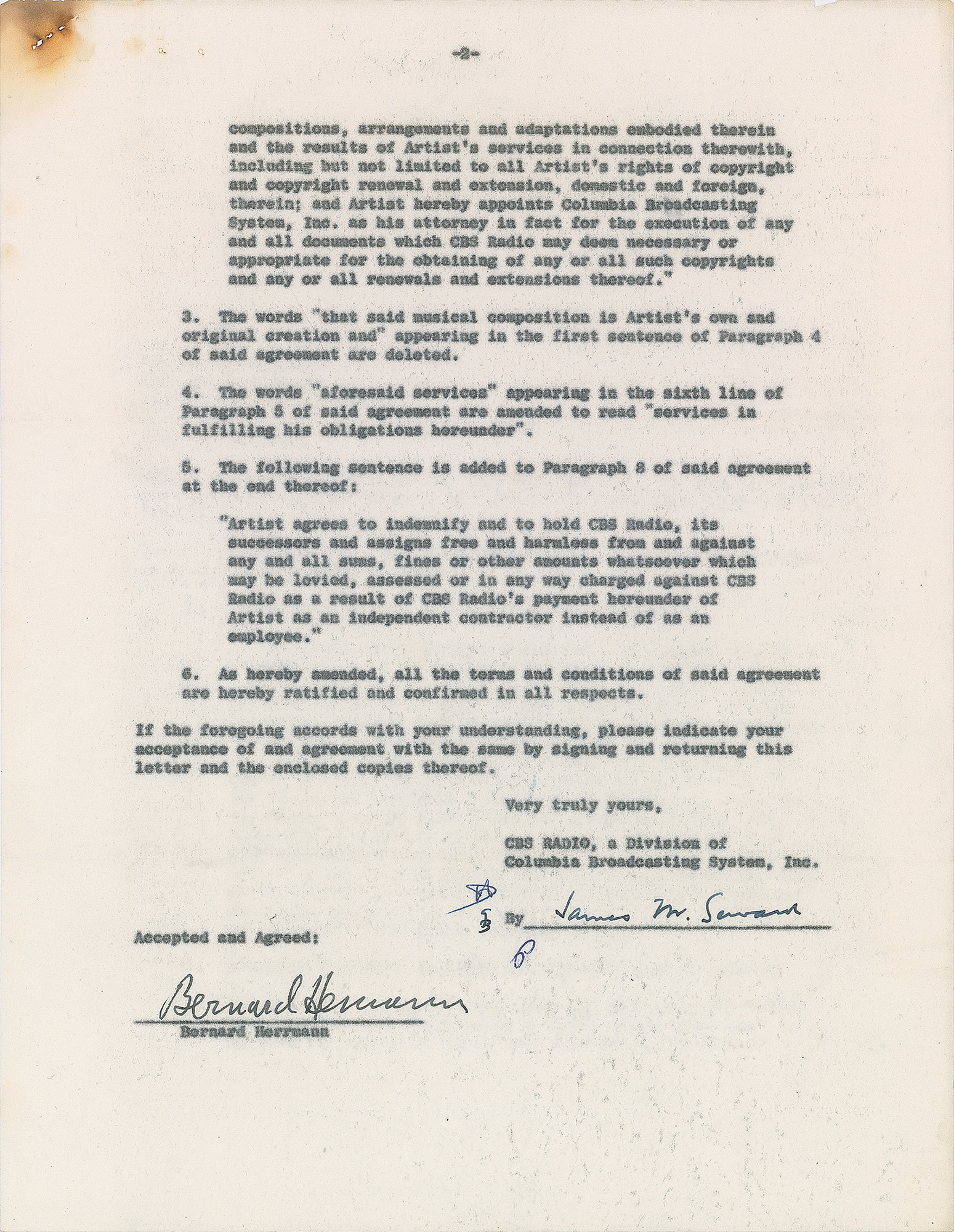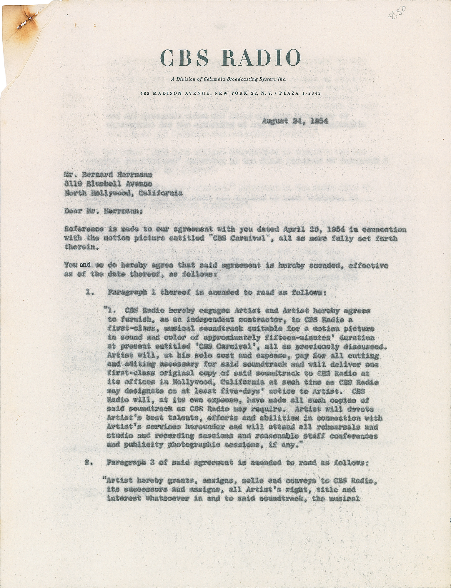 Distinguished Academy Award-winning American composer and conductor (1911-1975) who, over the course of four decades, earned a place among the most influential figures in the field of film music. Renowned for his collaborations with Alfred Hitchcock—most famously on the scores for Psycho, North by Northwest, The Man Who Knew Too Much, and Vertigo—his other notable achievements include scores for such iconic classics as Citizen Kane, The Day the Earth Stood Still, Taxi Driver, and The Magnificent Ambersons. DS, two onionskin pages, 8.5 x 11, August 24, 1954. Agreement between Herrmann and CBS Radio by which he agrees to furnish a "first-class, musical soundtrack suitable for a motion picture in sound and color of approximately fifteen-minutes' duration at present entitled 'CBS Carnival.'" Neatly signed at the conclusion in fountain pen. In fine condition, with some rusty paperclip stains to upper left corner.