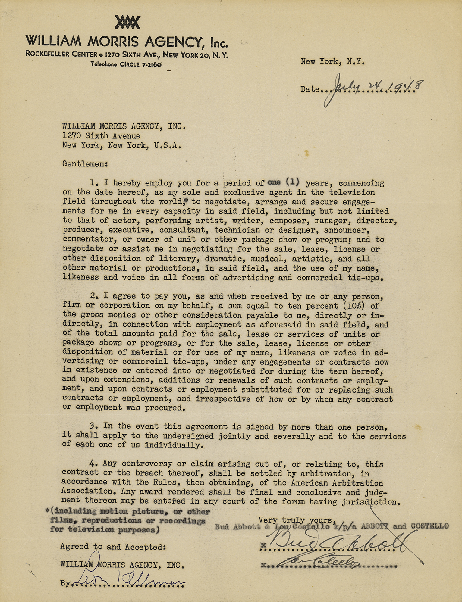 DS, signed "Bud Abbott" and "Lou Costello," one page, 8.5 x 11, July 24, 1948. Document by which Abbott and Costello agree to employ the William Morris Agency as "sole and exclusive agent in the television field throughout the world (including motion picture, or other films, reproductions or recordings for television purposes)." Signed at the conclusion in fountain pen by the famed comedic duo, and countersigned by a representative of the agency. In fine condition.