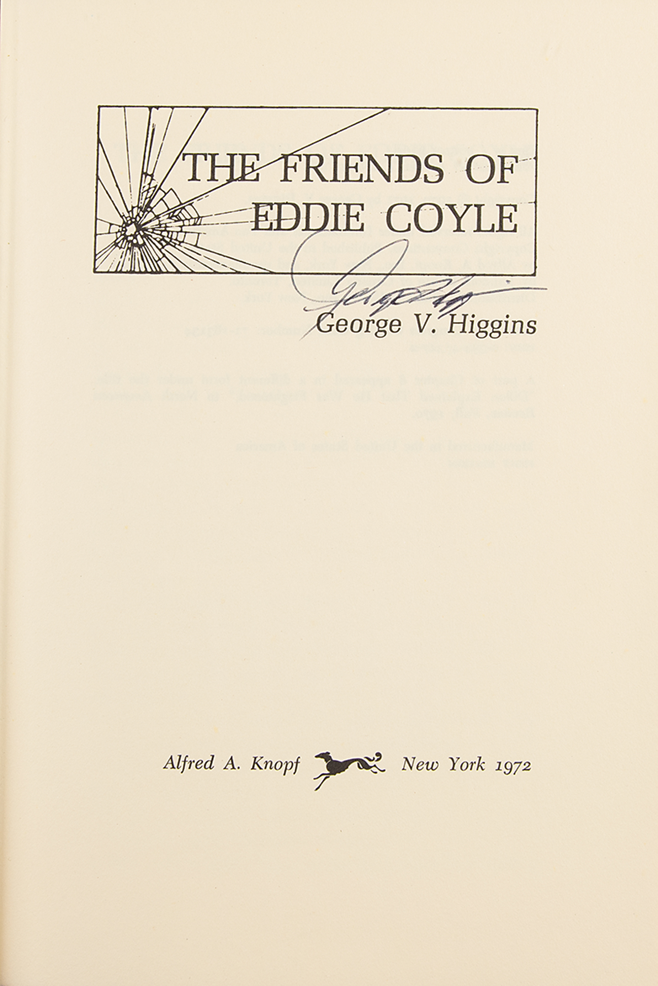 Signed book: The Friends of Eddie Coyle. First edition. NY: Alfred A. Knopf, 1972. Hardcover with dust jacket, 6 x 8.5, 183 pages. Signed on the title page in blue ballpoint by George V. Higgins. Includes a glossy 10 x 8 publicity photo of Robert Mitchum in the film adaptation of the novel, signed in violet felt tip. In fine condition, with light creasing to the Mitchum photo.