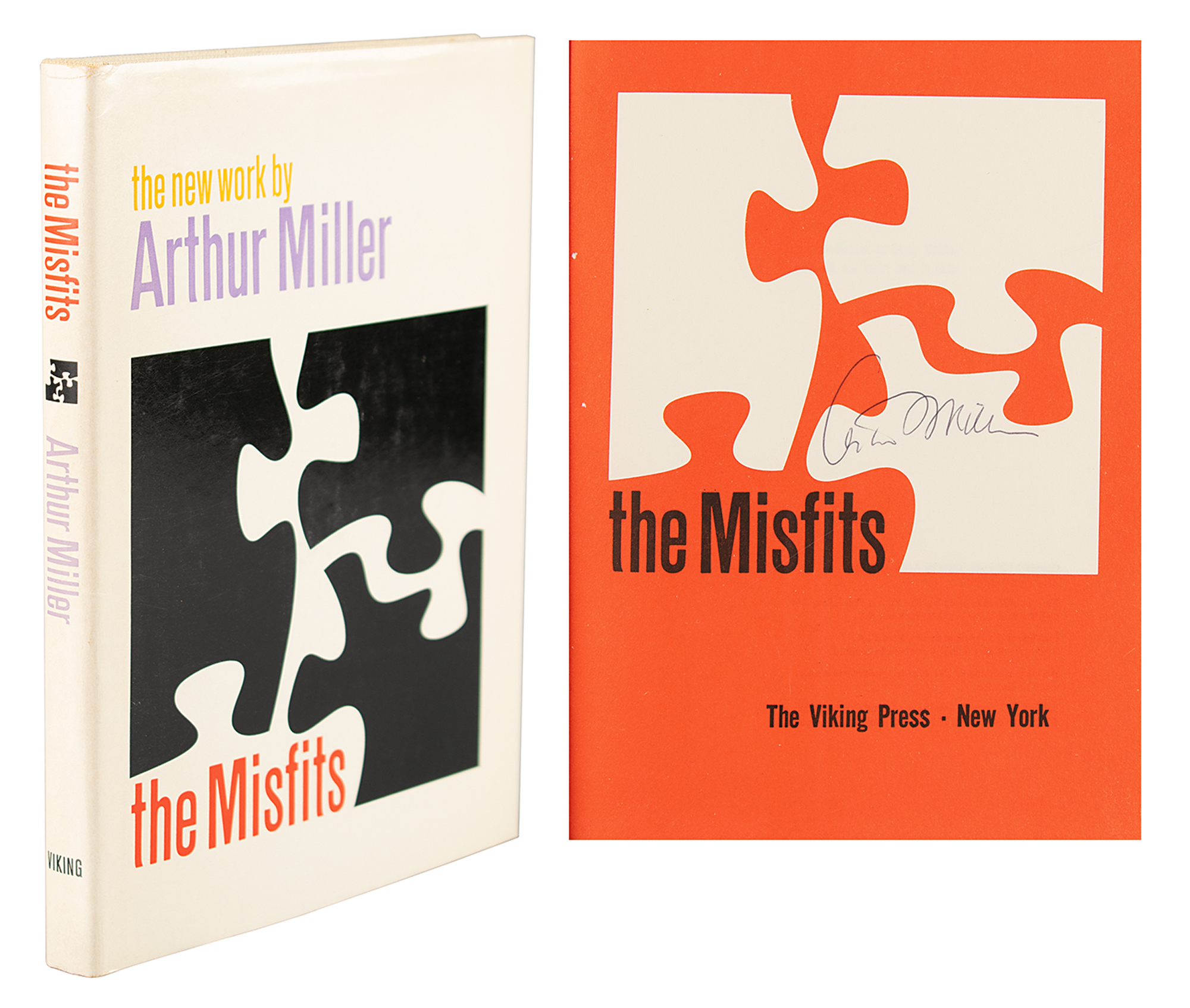 Signed book: The Misfits. First edition. NY: The Viking Press, 1961. Hardcover with dust jacket, 6.75 x 9.25, 132 pages. Signed on the title page in blue ballpoint, "Arthur Miller." Autographic condition: fine. Book condition: F/NF, with a price-clipped jacket. This book—self-described as a 'cinema-novel'—is an adaptation of Miller's screenplay for The Misfits, which starred his wife, Marilyn Monroe, alongside Clark Gable and Montgomery Clift. Shortly before the troubled film's 1961 premiere, Miller and Monroe divorced after their five years of marriage.
