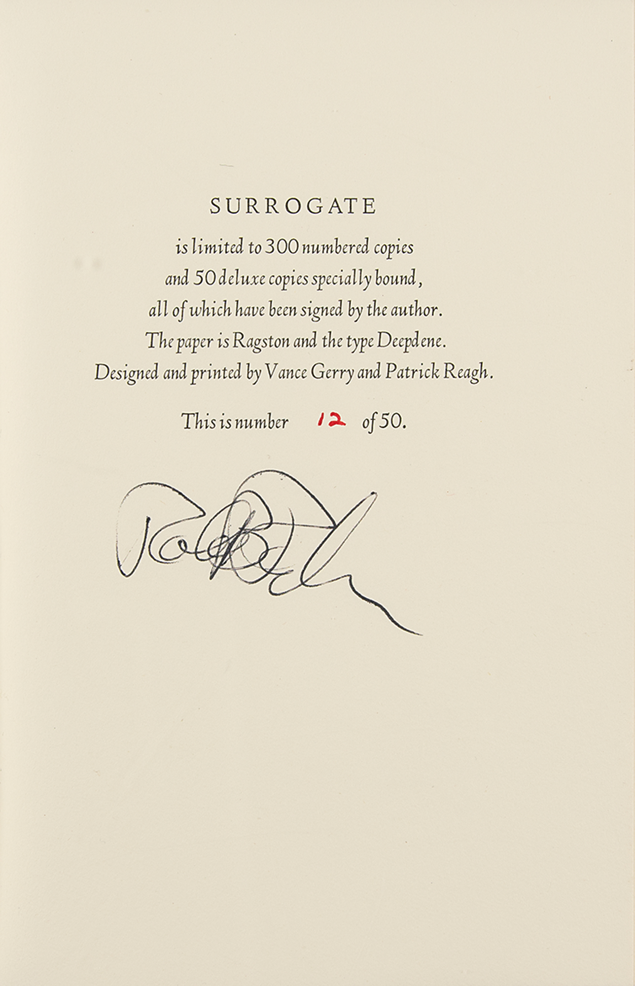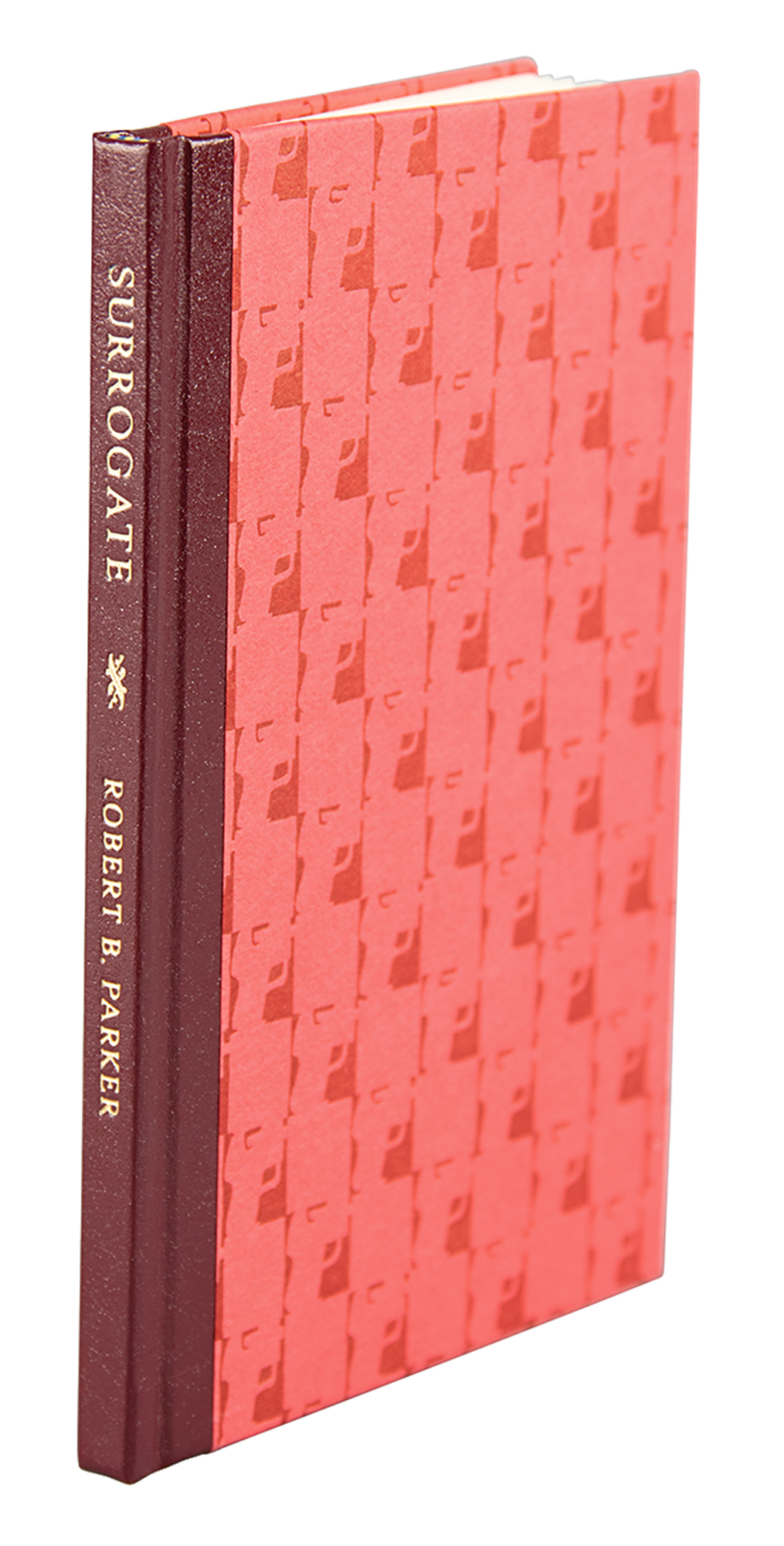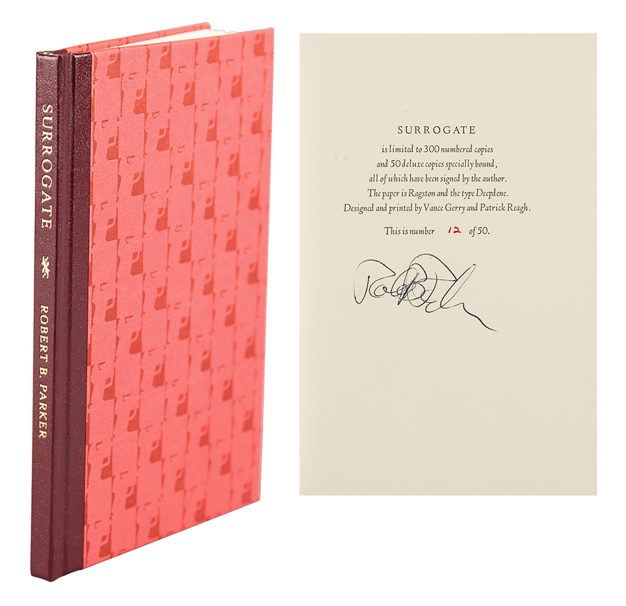 Signed book: Surrogate. Deluxe limited edition, numbered 12/50. Northridge, CA: Lord John Press, 1982. Hardcover quarter bound in gold-stamped burgundy leather with slipcase, 4.25 x 6.25, 27 pages. Signed on the colophon in black ballpoint by Robert B. Parker. In very fine condition.