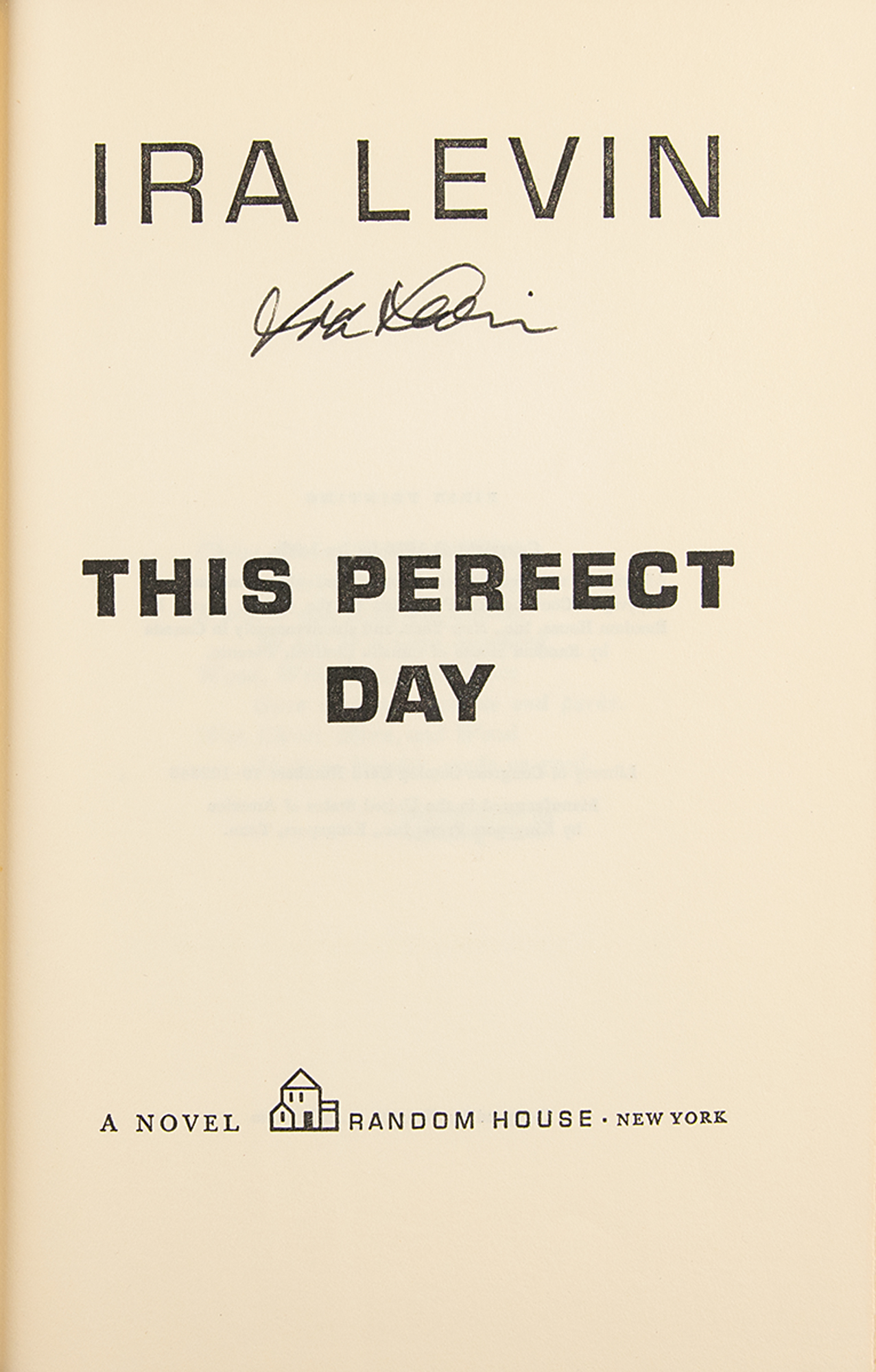 Signed book: This Perfect Day. First edition. NY: Random House, 1970. Hardcover with dust jacket, 5.75 x 8.5, 309 pages. Signed on the title page in black felt tip, "Ira Levin." In fine condition, with a tiny chip to the front panel of the unclipped jacket. A desirable and uncommon signed example of Levin's third novel, and one of only two Levin novels yet to be adapted to film.