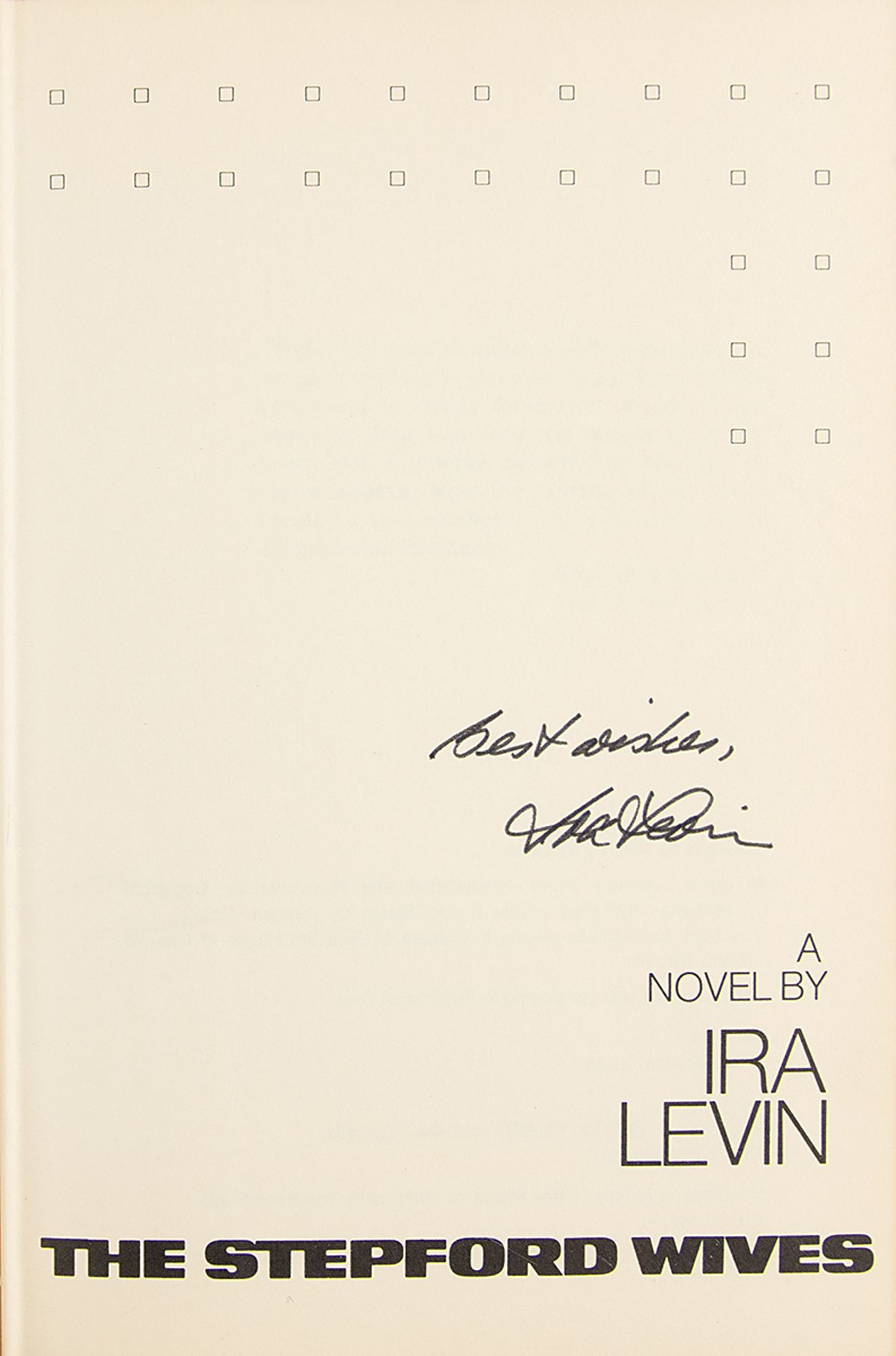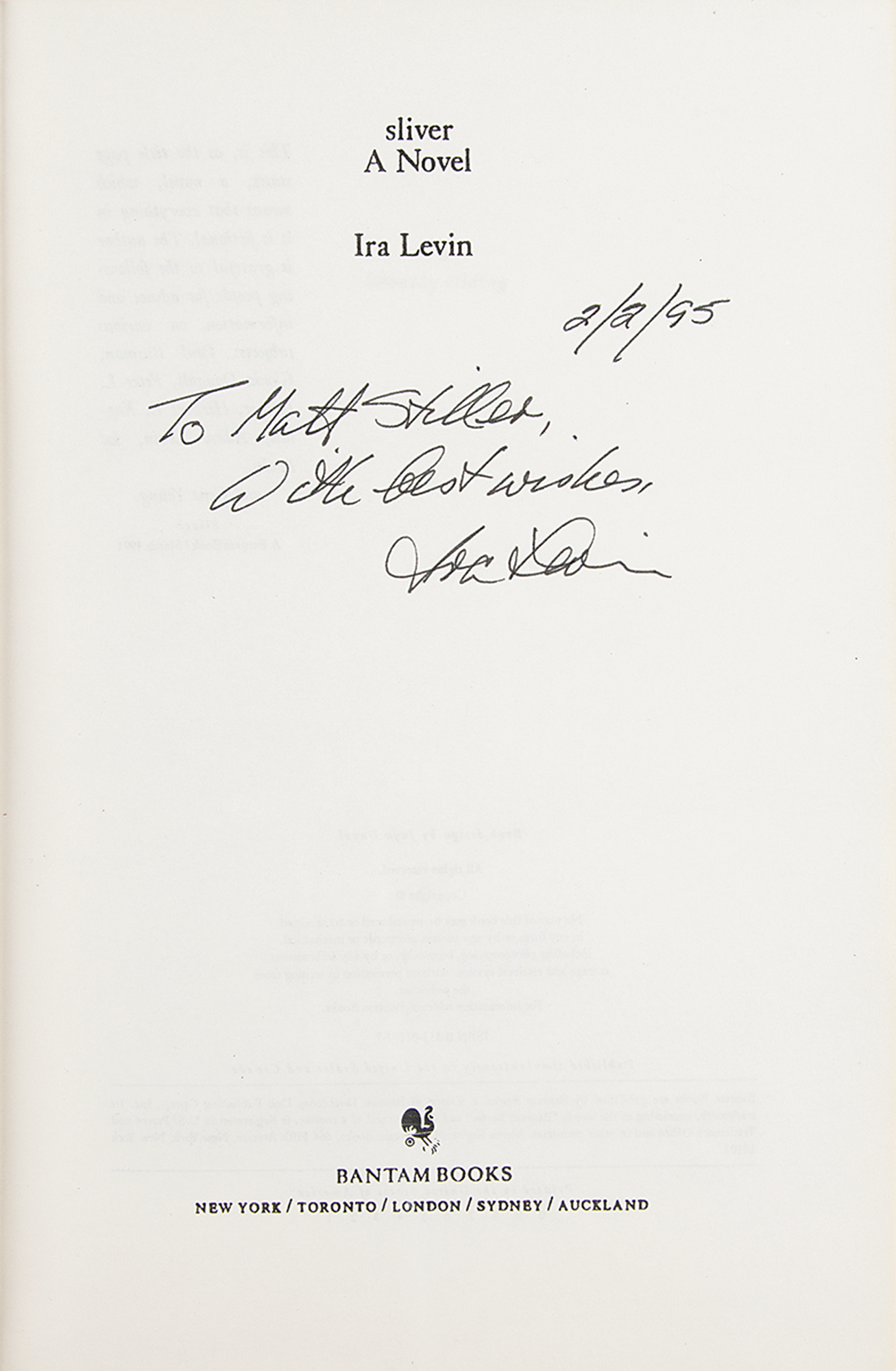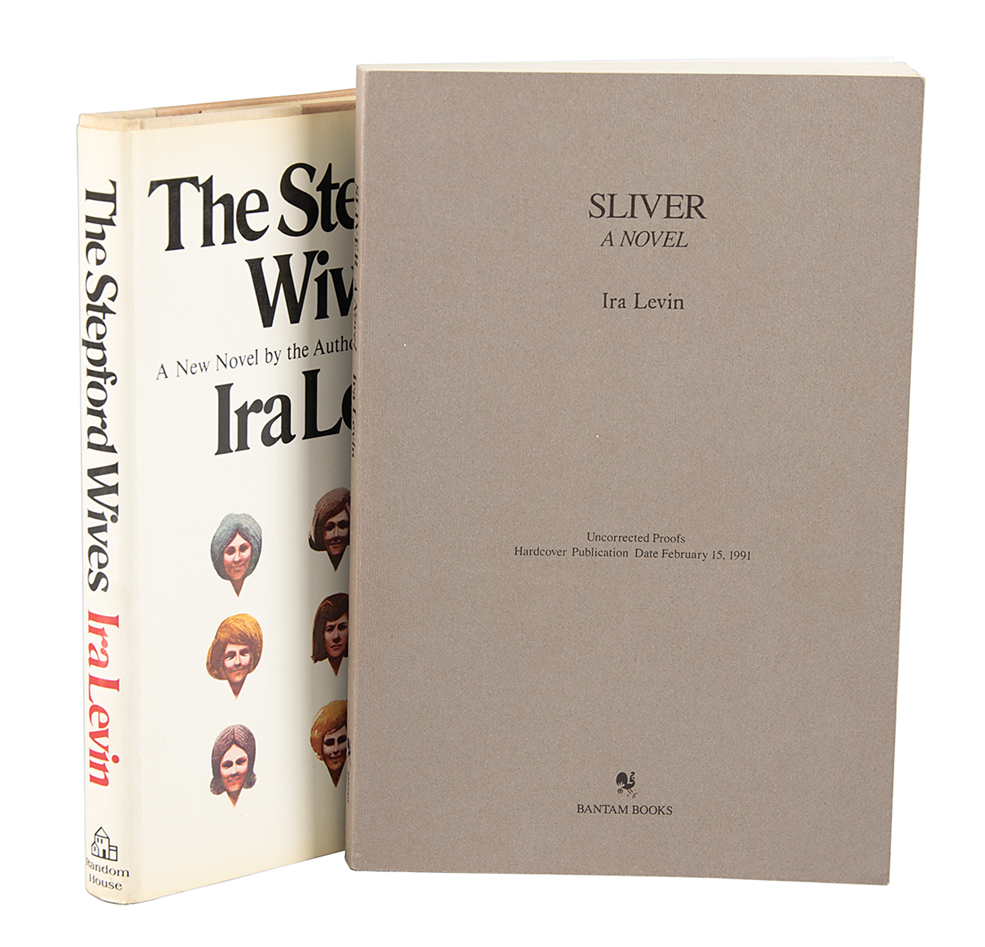 Two books: a first edition of The Stepford Wives, hardcover with dust jacket, published by Random House in 1972, signed on the title page in black felt tip by Ira Levin; and an uncorrected proof of Sliver: A Novel, softcover, published by Bantam Books in 1991, signed and inscribed on the title page in black felt tip by Ira Levin. In overall fine condition, with the jacket for The Stepford Wives price-clipped (as issued, with affixed price sticker). Both books were adapted into films: The Stepford Wives in 1975 (starring Katharine Ross) and 2004 (starring Nicole Kidman), and Sliver in 1993 (starring Sharon Stone).