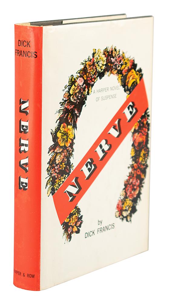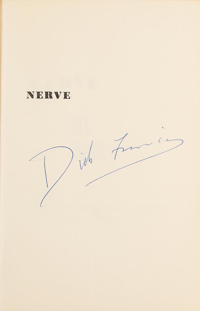 British steeplechase jockey and crime writer (1920-2010) whose novels center on horse racing in England. Signed book: Nerve. First American edition. NY: Harper & Row, 1964. Hardcover with dust jacket, 5.75 x 8.25, 273 pages. Signed on the half-title page in blue ballpoint, "Dick Francis." In fine condition. Accompanied by a custom-made clamshell box. A fine example of Francis's second novel.
