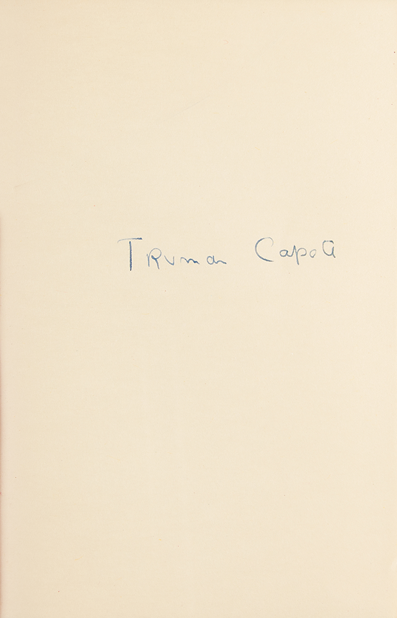 Signed book: In Cold Blood. First edition. NY: Random House, 1965. Hardcover with dust jacket, 6 x 8.5, 343 pages. Neatly signed on a free end page in fountain pen, "Truman Capote." Autographic condition: fine. Book condition: NF/VG, with a few professional repairs to the dust jacket. Accompanied by a custom-made clamshell box.
