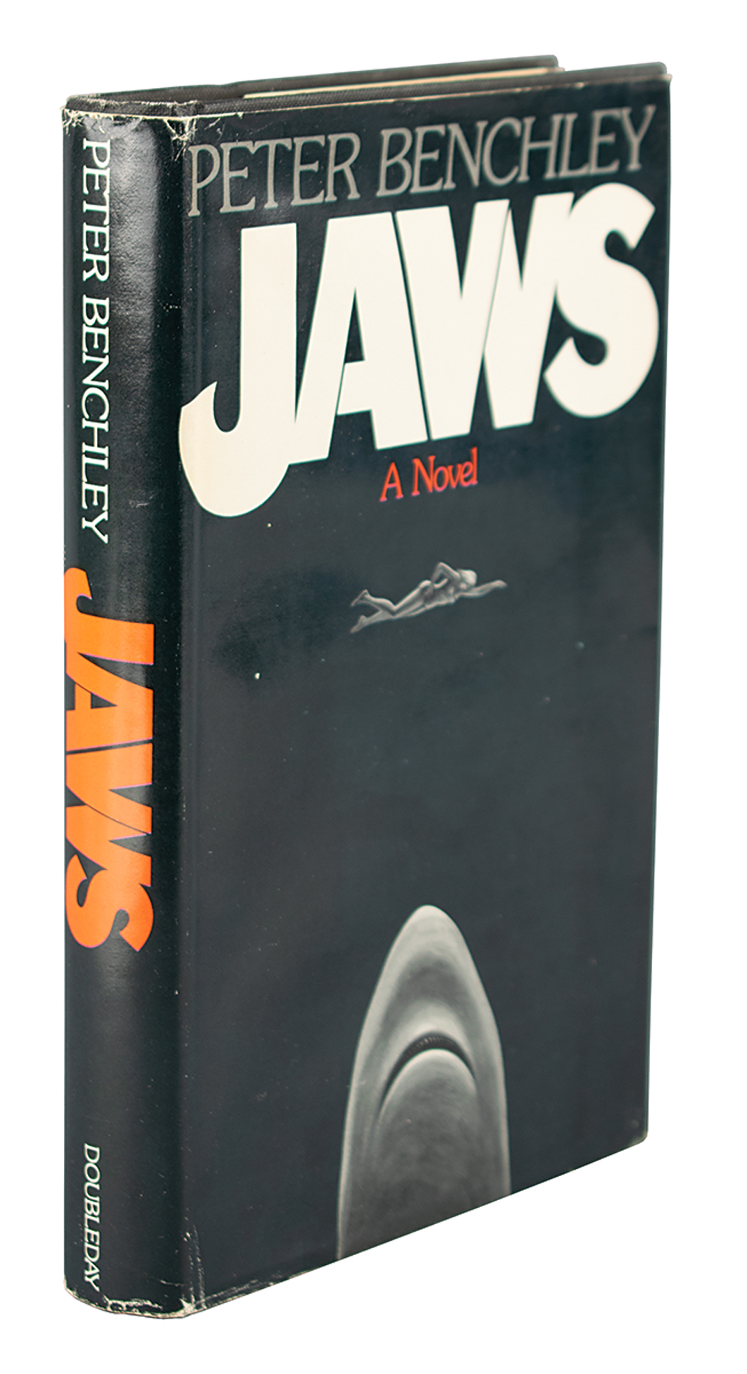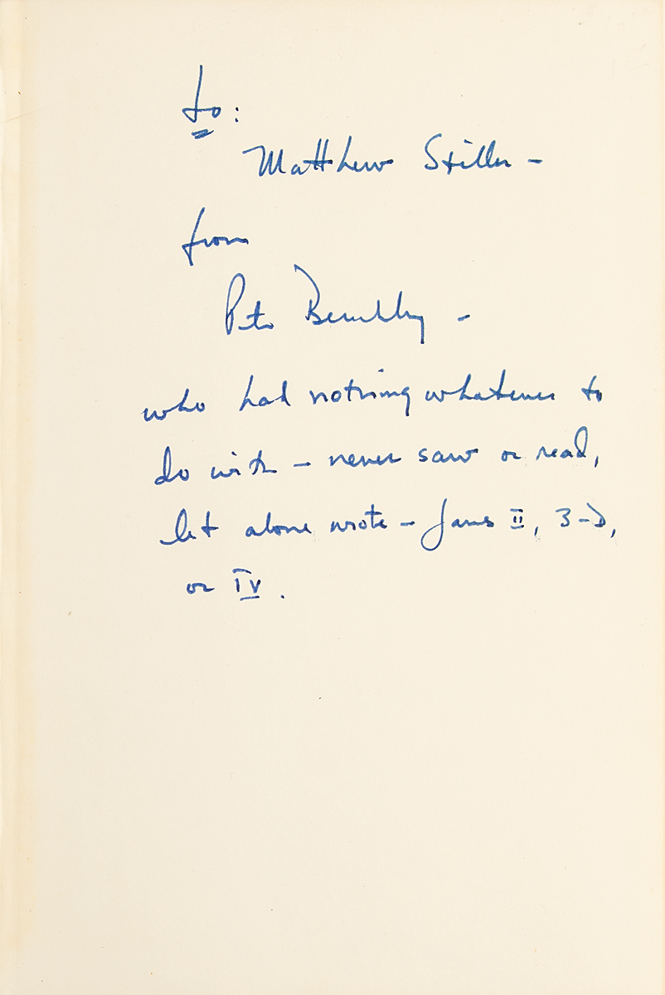 Signed book: Jaws. Later printing. Garden City, NY: Doubleday, 1974. Hardcover with dust jacket, 5.75 x 8.5, 311 pages. Signed and inscribed on the first free end page in blue felt tip, "To Matthew?from Peter Benchley, who had nothing whatever to do with—never saw or read, let alone wrote—Jaws II, 3-D, or TV." In fine condition, with minor edgewear to jacket.
