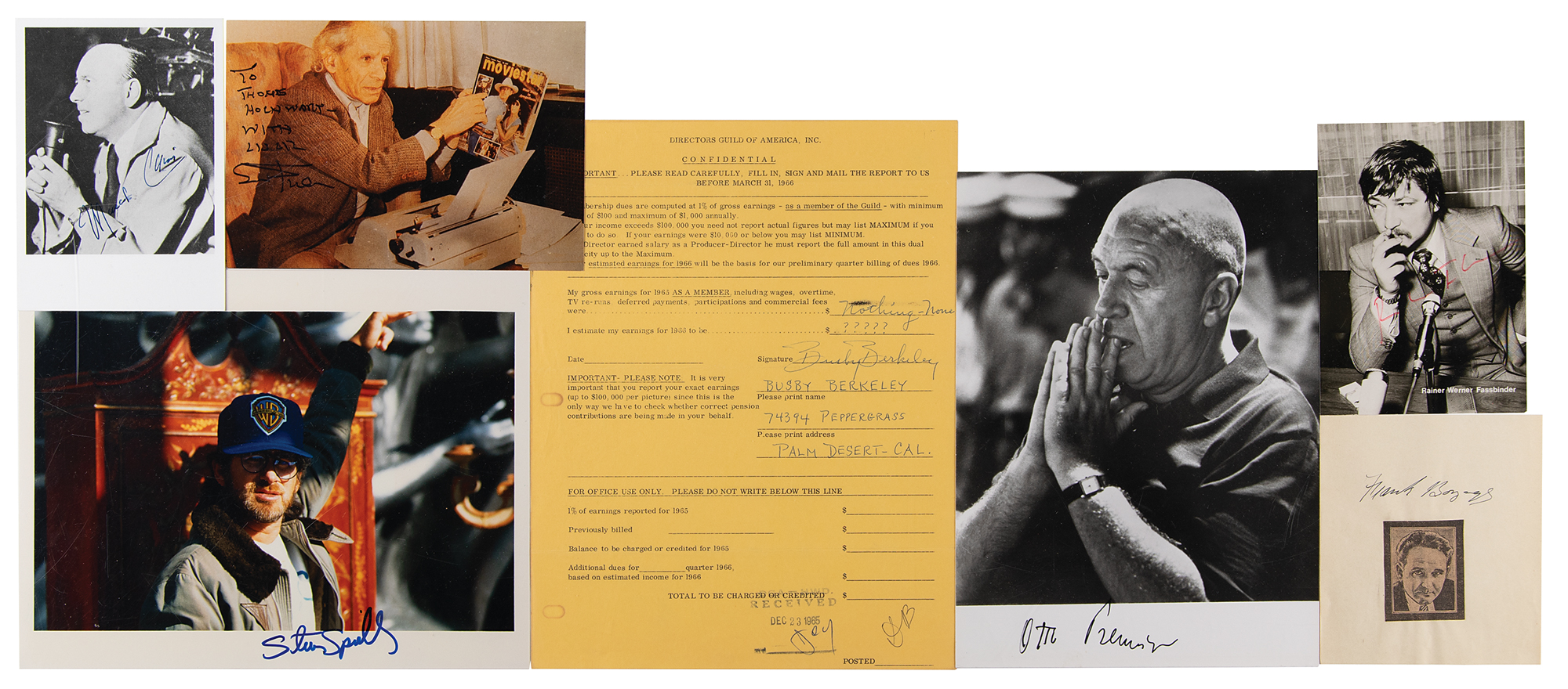 Seven items signed by noted directors from around the world, including: Steven Spielberg (SP), Otto Preminger (SP), Sam Fuller (SP), Frank Borzage (signature), Marcel Carné (SP), Rainer Werner Fassbinder (SP), and Busby Berkeley (DS). In overall fine condition.