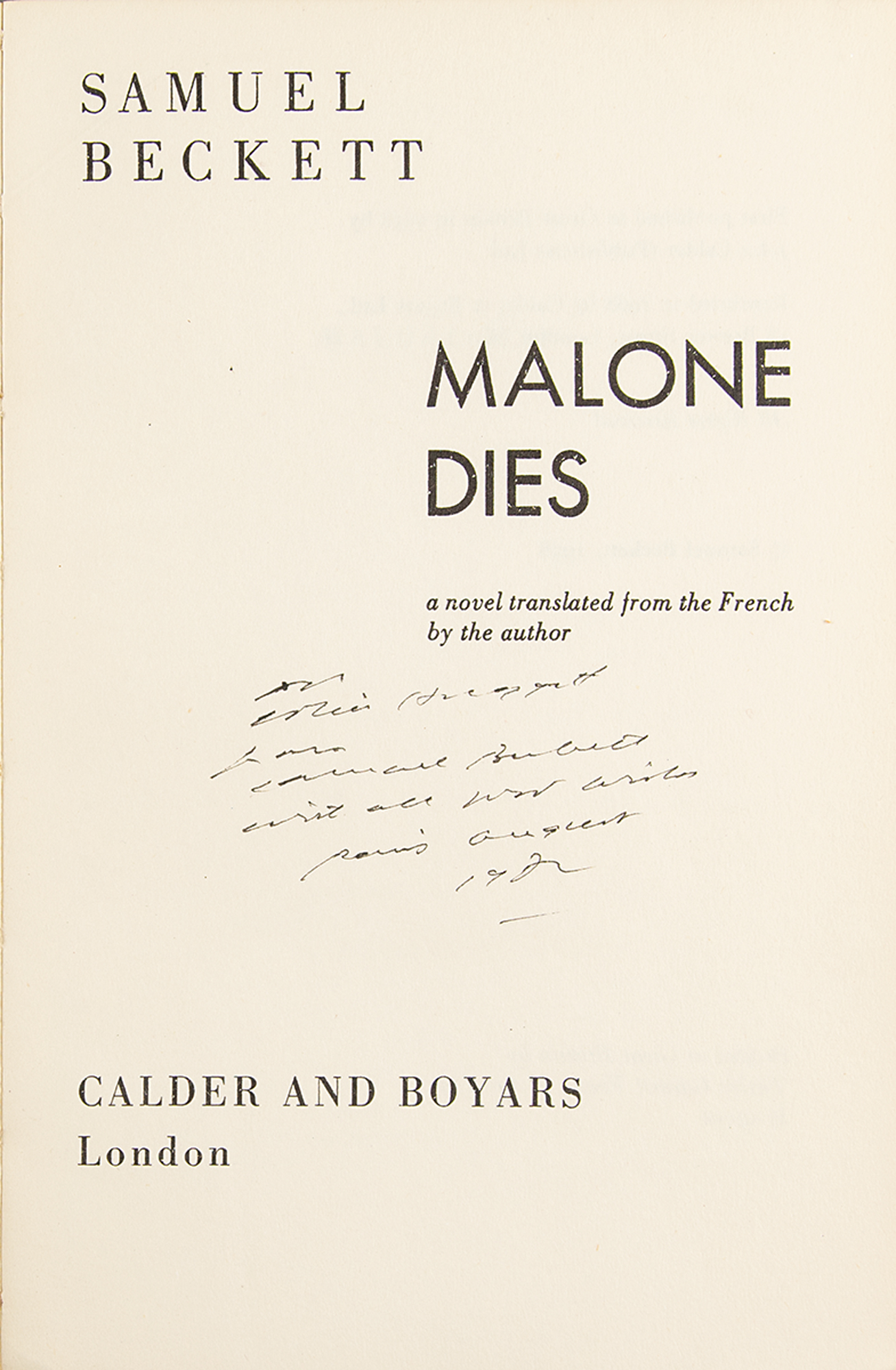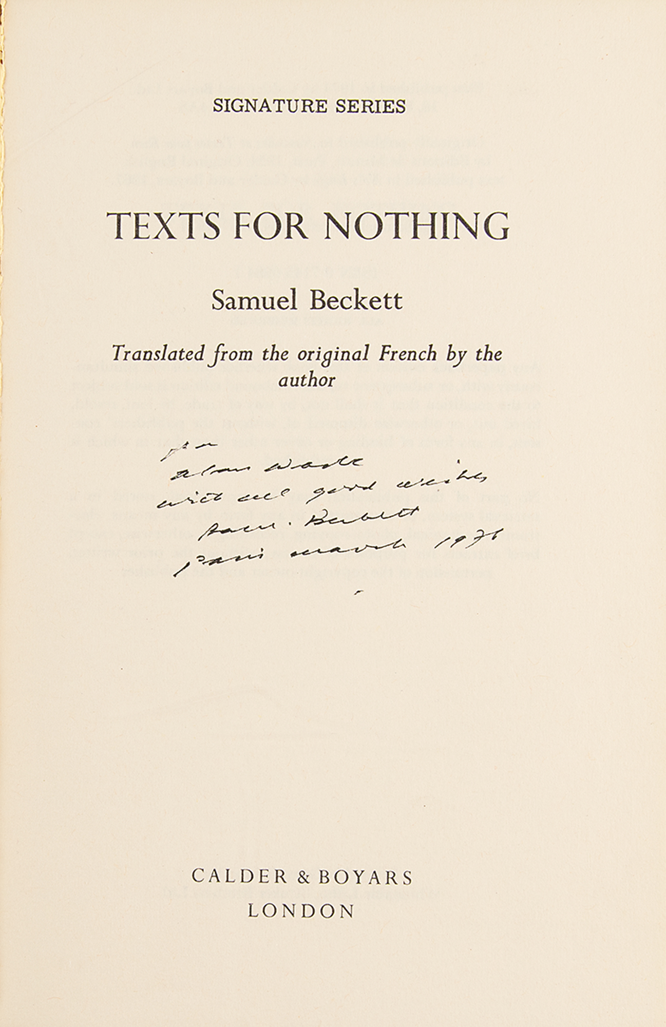 Two desirable presentation copies: a softcover edition of Malone Dies, published by Calder & Boyars in 1968, signed and inscribed on the title page in black ink by Beckett; and a softcover edition of Texts for Nothing (Signature 21), first thus, published by Calder & Boyars in 1974, signed and inscribed on the title page in black ink by Beckett. In overall very good condition, with creasing to the cover of Malone Dies.